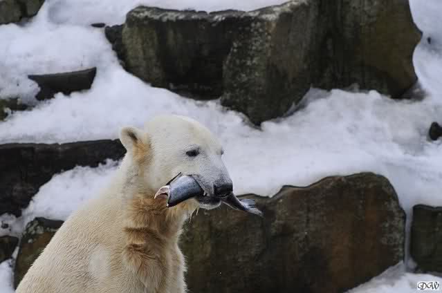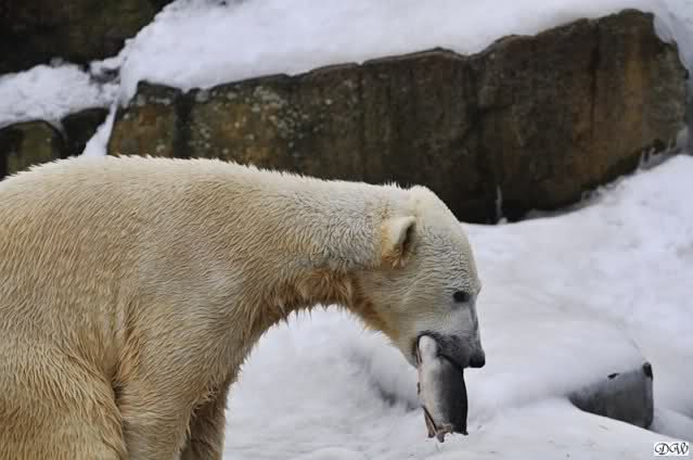 Knut bekam eine riesige Portion Futter. Neben all den Dingen, die es immer gibt, gab es sehr schöne Weintrauben und einen riesigen Lachs, von dem eine vierköpfige Familie satt geworden wäre. Außerdem gab es den von Herrn Henkel versprochenen Donut. Der verschwand in Sekundenschnelle im Bärenmagen.