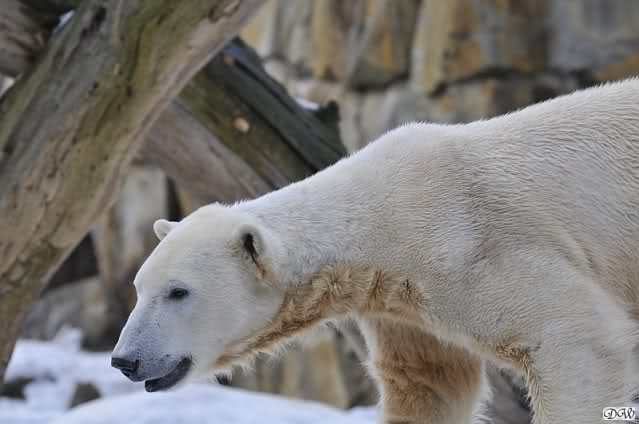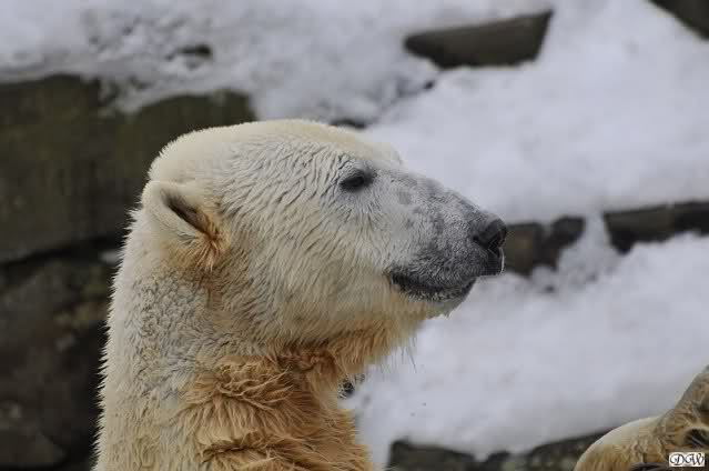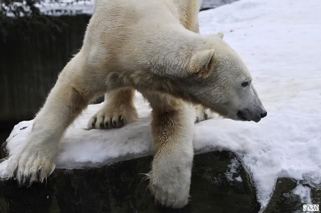 Bei Knuts und Giannas Gehege standen die Besucher inzwischen dicht an dicht. Ich sah viele bekannte Gesichter, aber auch eine Menge Touristen. Knut läuft nun nicht mehr so viel hin und her wie früher, als er noch allein war. Die Lauferei beginnt vielleicht fünf Minuten vor der Fütterung.