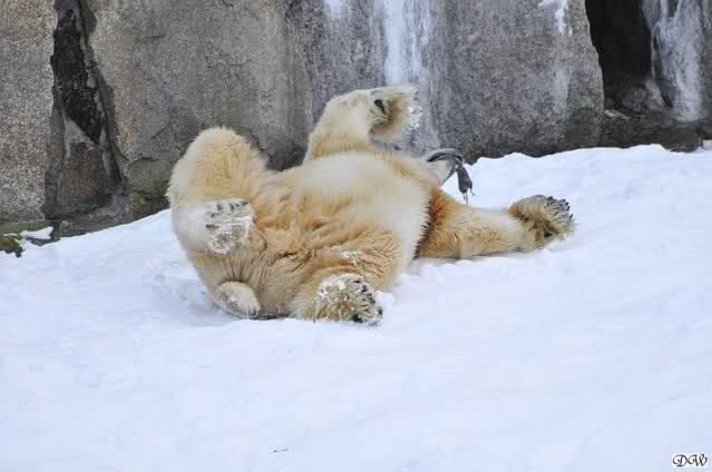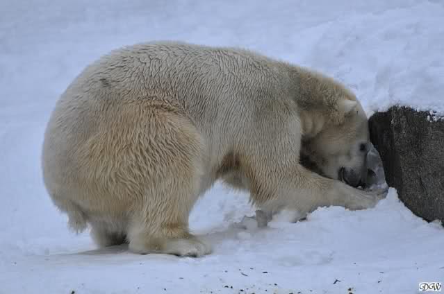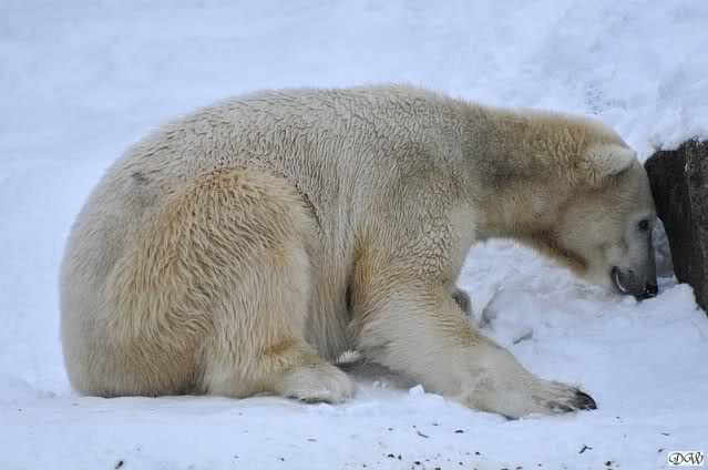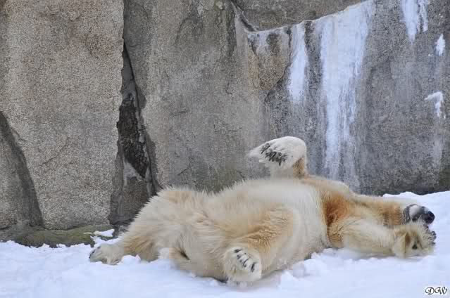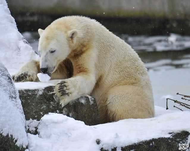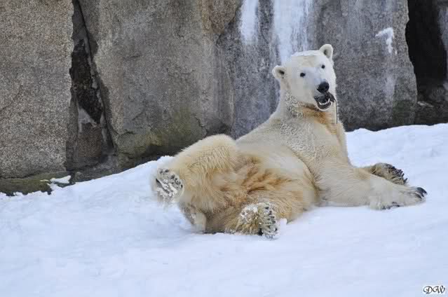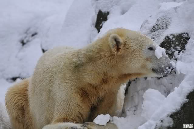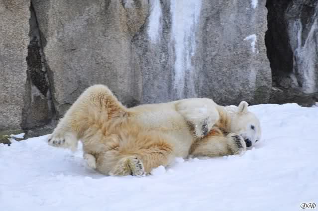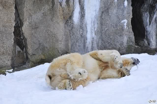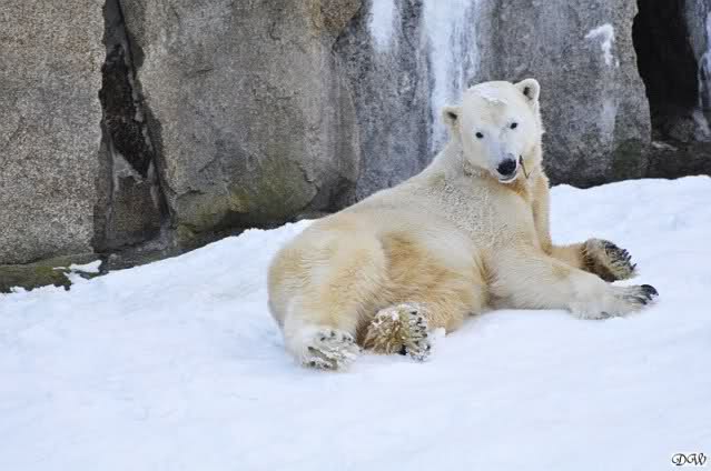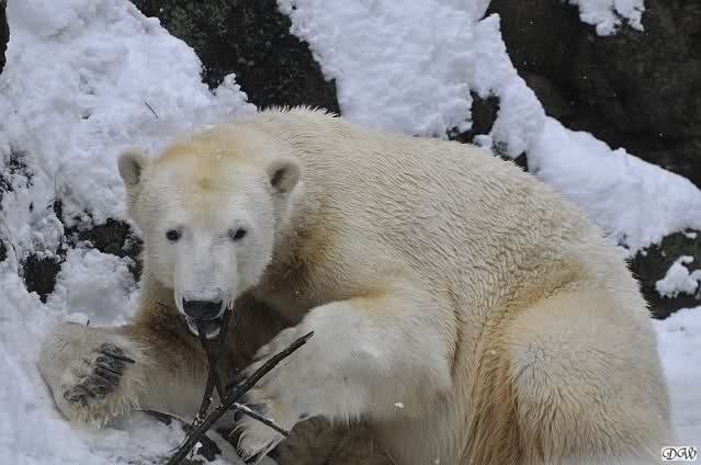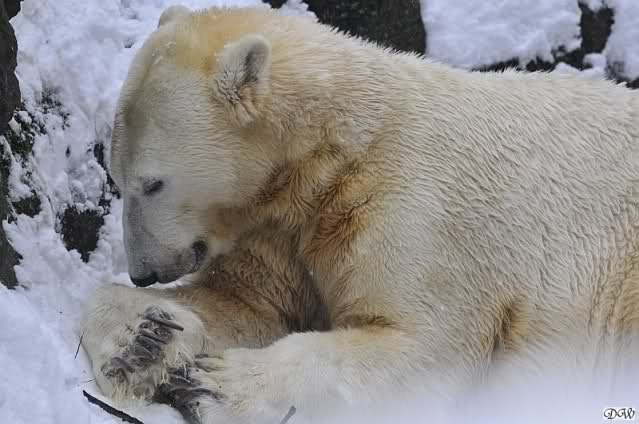 Nancy schlief in Kati's Höhle, Tosca lief langsam herum, Kati jedoch kam immer wieder um zu sehen was Knut macht. Immer wenn er sich hochstellte um zu sehen was auf dem Felsen los war, schaute er in ihr Gesicht. Auch Knut war etwas bequem heute. Schneebälle, die ihm zugeworfen wurden, holte er nur, wenn er sie sitzend oder liegend erreichen konnte. Konnte er es nicht, schaute er wieder hoch und wartete auf den nächsten. Bekam er den Schneeball, spielte er damit und verspeiste ihn dann.