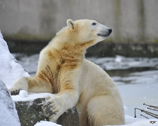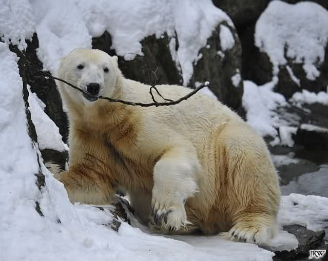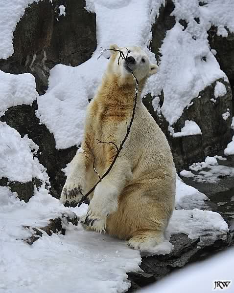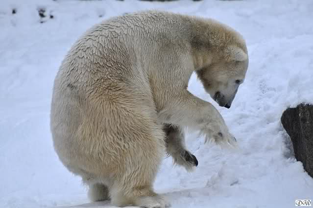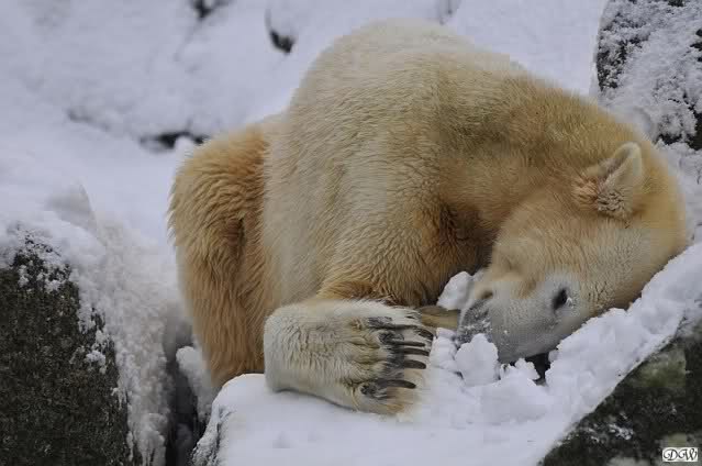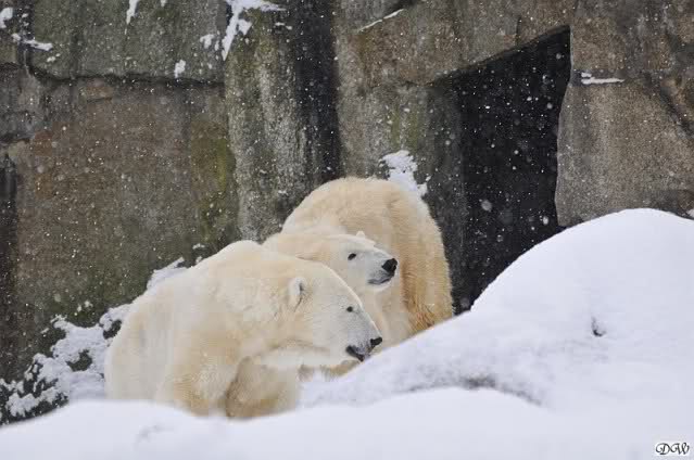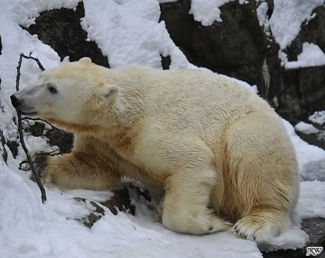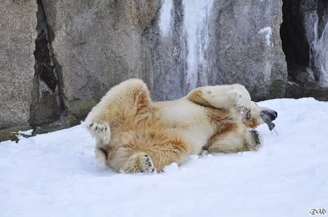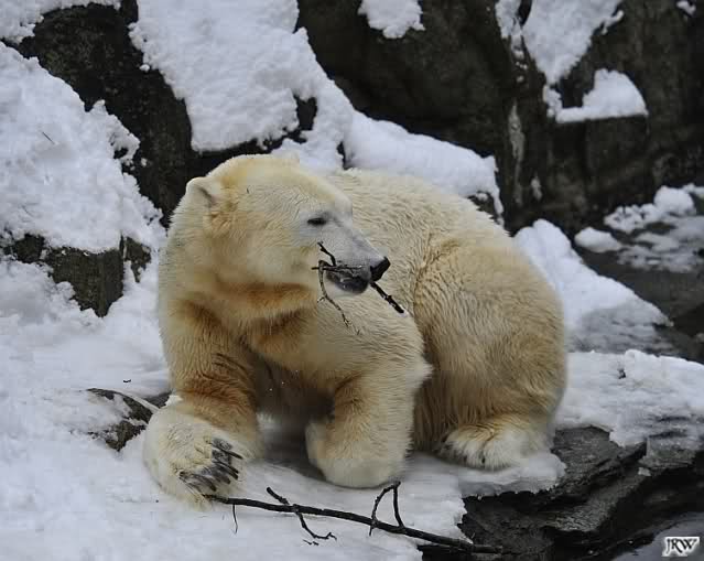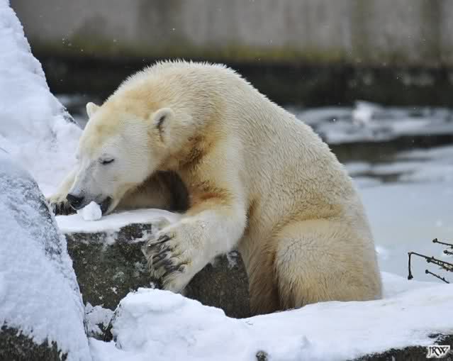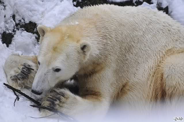 Nancy schlief in Kati's Höhle, Tosca lief langsam herum, Kati jedoch kam immer wieder um zu sehen was Knut macht. Immer wenn er sich hochstellte um zu sehen was auf dem Felsen los war, schaute er in ihr Gesicht. Auch Knut war etwas bequem heute. Schneebälle, die ihm zugeworfen wurden, holte er nur, wenn er sie sitzend oder liegend erreichen konnte. Konnte er es nicht, schaute er wieder hoch und wartete auf den nächsten. Bekam er den Schneeball, spielte er damit und verspeiste ihn dann.