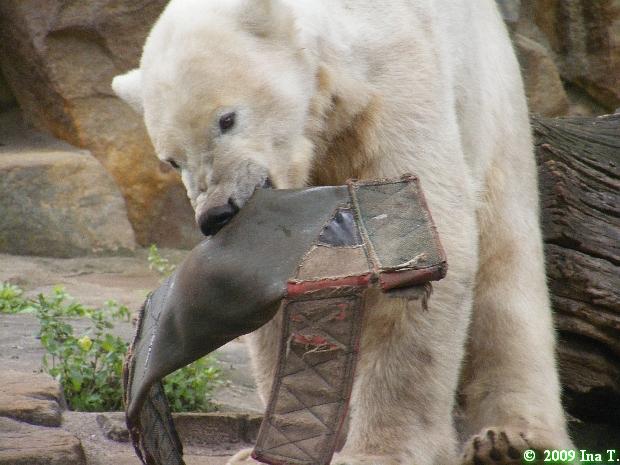 Heute war es endlich soweit. Knut feierte seinen 30 - Monats - Geburtstag, und es waren viele Knut-Fans zum feiern gekommen. Sie brachten wieder viele Leckereien mit. Auch eine Rose für Knut war dabei, die er neugierig von weitem betrachtete. Unter anderem bekam er von einer Besucherin einen neuen gefüllten Jutesack.