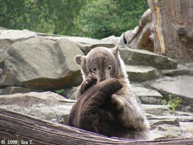 Bei den Eisbären verweilte ich ein bisschen länger. Ich setze mich dort gern auf eine Bank und sehe ihnen zu. Das beruhigt. So machte ich es auch heute. Dann setzte ich meinen Weg fort, in Richtung Wölfe und Nasenbären. Leider habe ich die Nasenbären nicht gesehen, sosehr ich auch nach ihnen Ausschau hielt. Schade. Ich liebe diese kleinen Kerle nämlich sehr. Auch das hat Knut geschafft: Vor Knut wusste ich kaum, was ein Nasenbär ist.