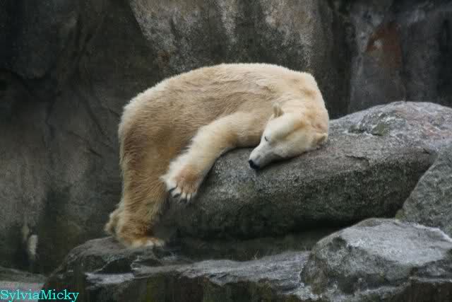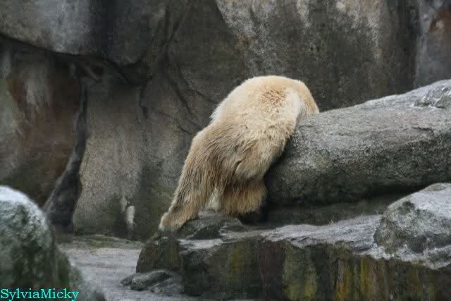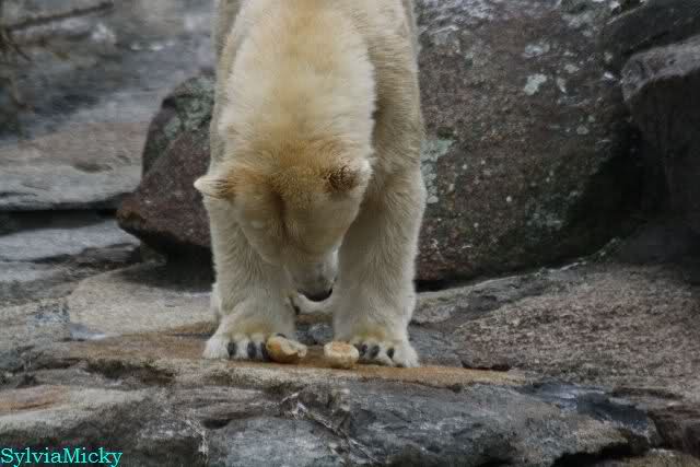 Auch heute war Ruhe am Vormittag angesagt. Knut wurde wieder auf dem Plateau gefüttert. Als die Bären gefüttert wurden, schubberte sich Nancy noch an dem Felsen.