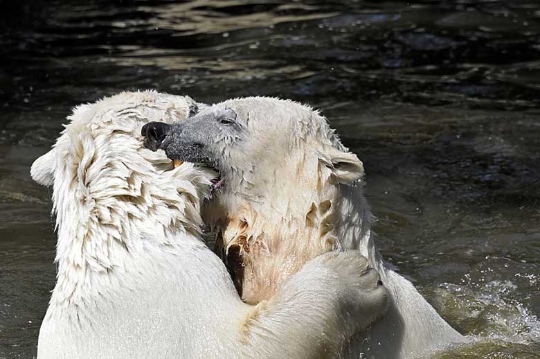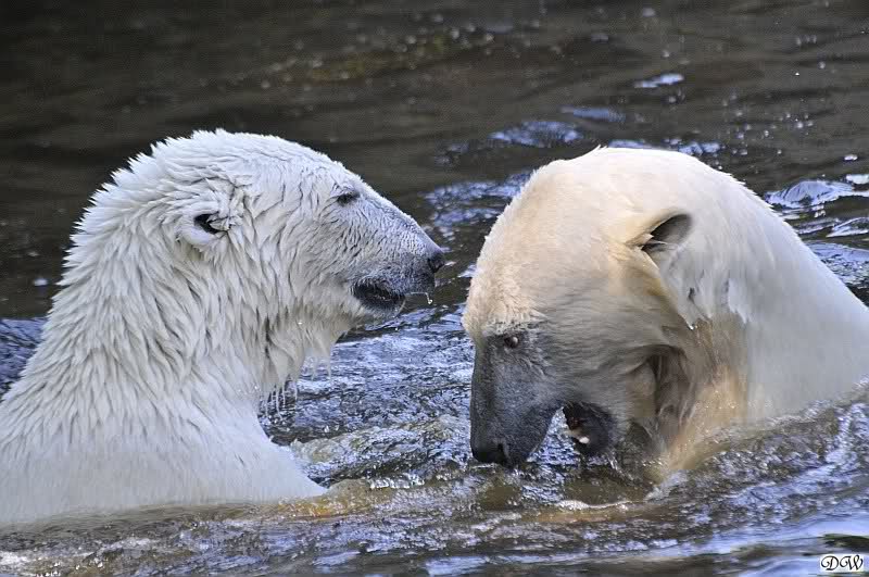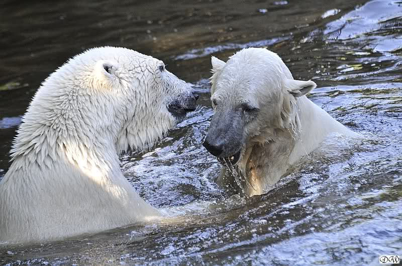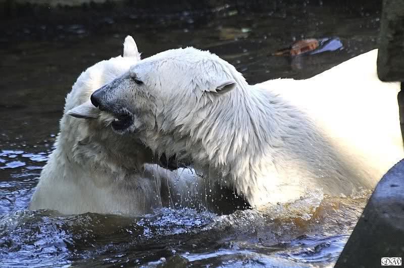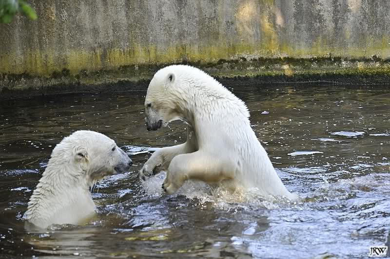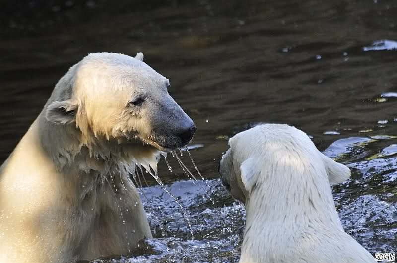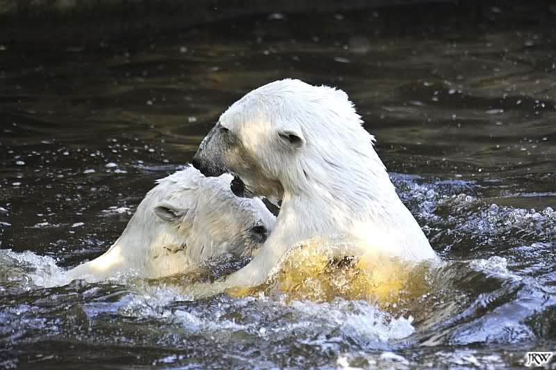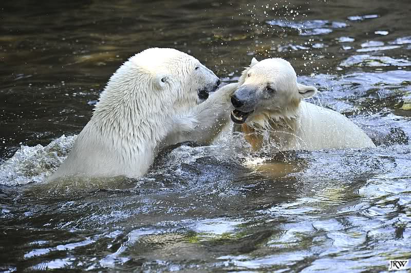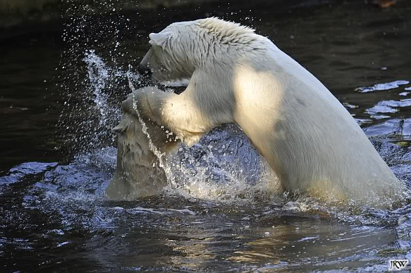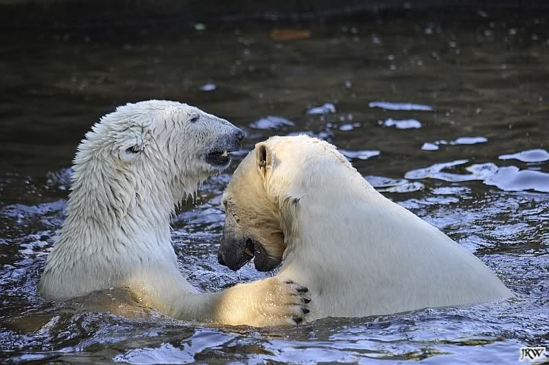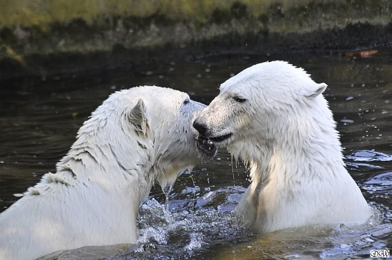 Danke, Frans, für die Wahnsinnsaufnahmen. Der Blick in das Maul eines Eisbären flößt schon Ehrfurcht ein. Um so erstaunlicher ist es, das sich Giovanna und Knut gegenseitig nicht weh tun, obwohl sie sich immer im Nacken das Anderen *festbeißen*. Aber es ist alles Spiel und Training fürs Leben.