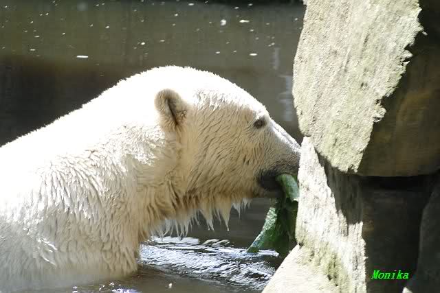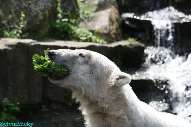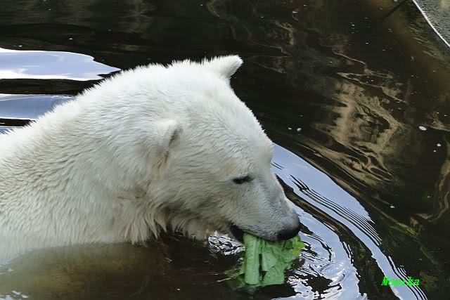 Der ungeliebte Salat. Knut nahm ihn mit ins Wasser, schwamm um die rechte Ecke. Nach der Fütterung ging Gianna auch ins Wasser, dann hörte man Knut laut brummen und Gianna kam kauend wieder hoch