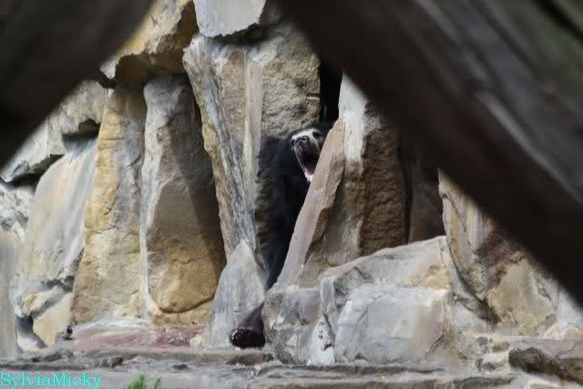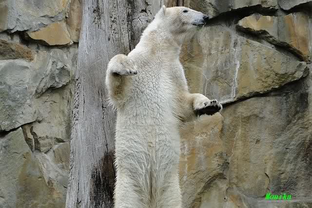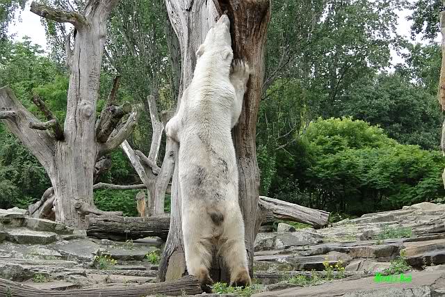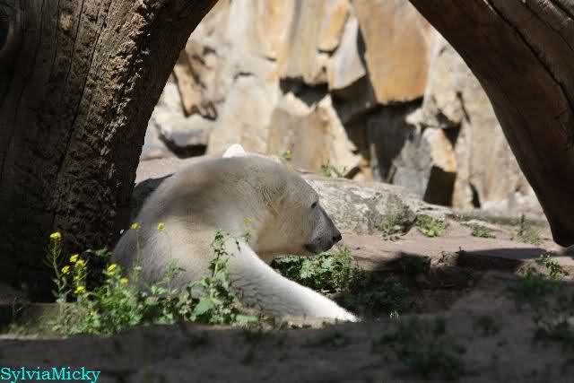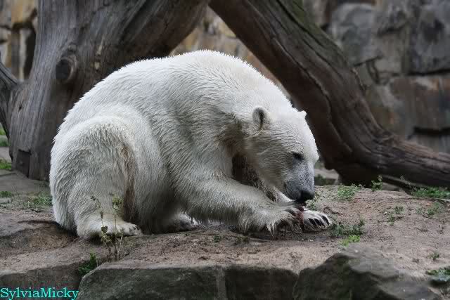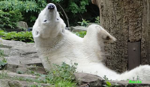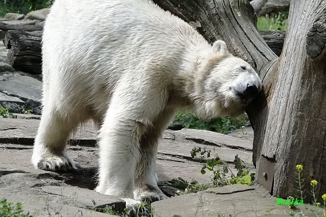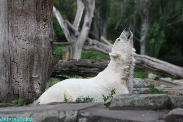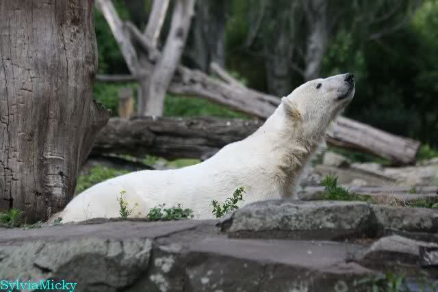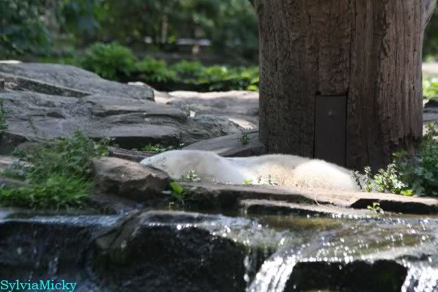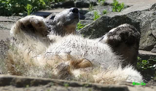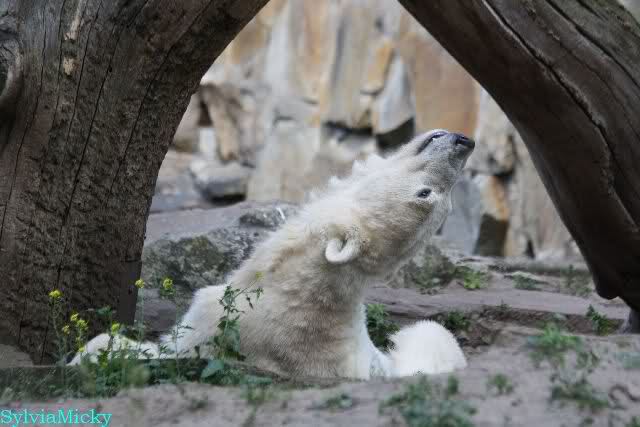 Einige Zeit vor der Fütterung erwachte Knut, streckte, reckte sich mit Katzenbuckeln und schlurfte hektisch zur rechten Seite. Da wurde dann wieder gedöst, zwischendurch gereckt, gestreckt und Katzenbuckel gemacht.