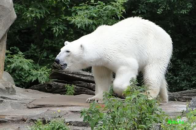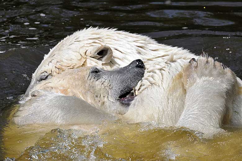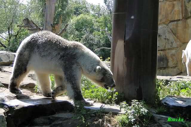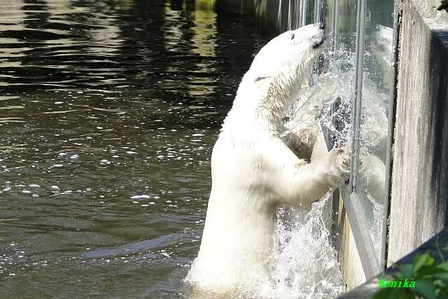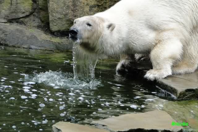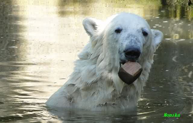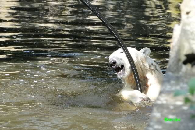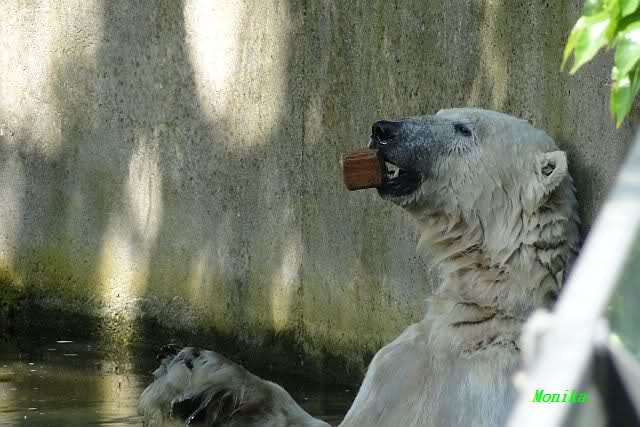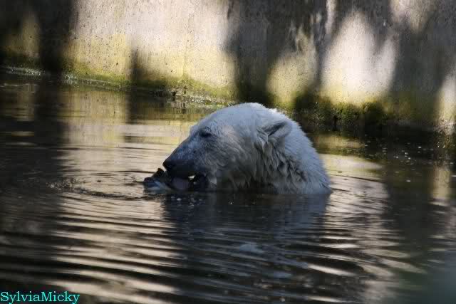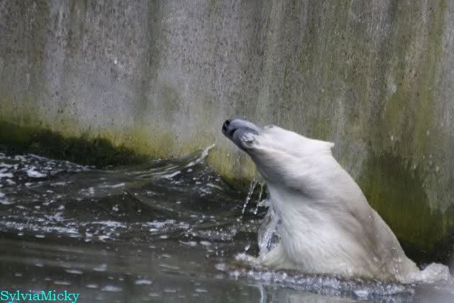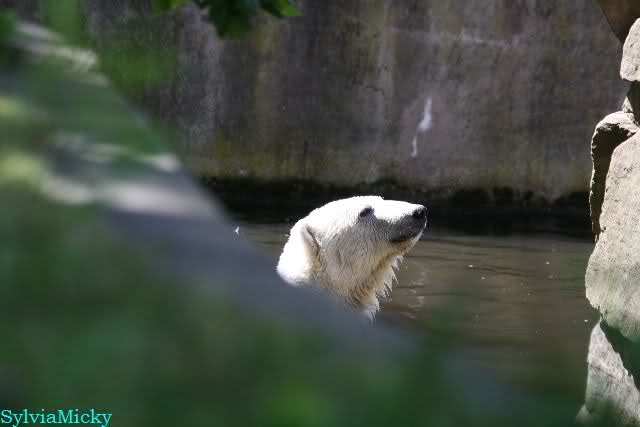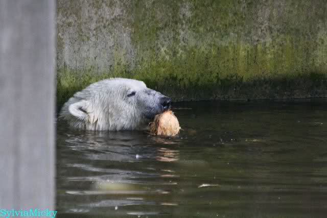 Nach der Fütterung lief Gianna wieder hin und her über die Anlage und Knut war im Wasser und pfriemelte mit einer Holzscheibe und einem Zweiglein rum.