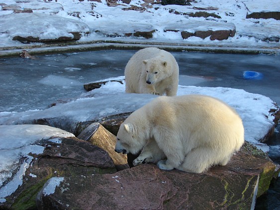 Als ich ankam, waren die beiden Bärchen gerade auf der kleinen Insel im Wasser. Rasputin ist ein ganz schön properes Kerlchen. Er ist gar nicht so sehr viel größer als Flocke, aber eindeutig wesentlich dicker. Mein Eindruck, was das Verstehen der beiden angeht, war erstmal nicht so wirklich positiv. Es sah aus, als würde Rasputin Flocke dauernd bedrängen und unterbuttern. Sie schien mir zeitweise nicht sehr glücklich, weil der freche Kerl sie immer wieder belästigt hat, was ihrerseits mit heftigem Gebrumme und Gefauche quittiert wurde. Er ist dann ins Wasser und sie, die doch so gerne schwimmt, wollte nicht rein. Allerdings ist im Moment auch nur ein kleiner Teil des Wassers eisfrei, das war ihr vielleicht einfach zu eng. Das ganze Spielzeug war eingefroren, so dass in der Hinsicht auch nicht viel ging. Als Flocke einen Karton aus irgendeiner Ecke gezogen hat, kam er gleich an und hat ihn ihr abgenommen. Er macht schon ganz gut einen auf dominant.