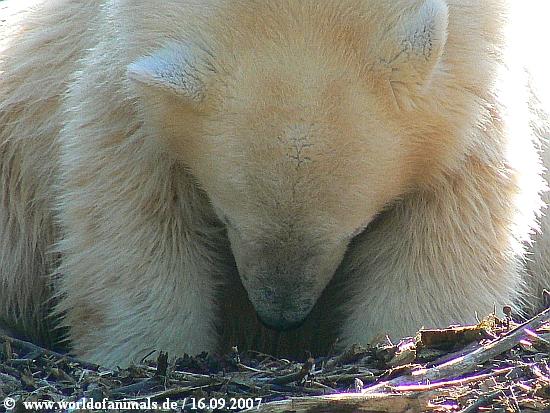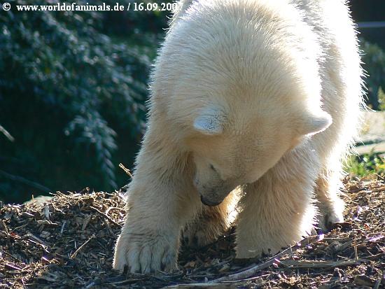 Knut on his bark mulch bed, searching a little peace of meat...Where is it ? / Knut auf seinem Bett aus Mulch, er sucht nach einem Rest von einem Stück Fleisch