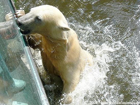Da ja kein Interesse mehr an unserem Schatz besteht, war es wieder rappelvoll. Heute Abend (ja, Hartmuth, hast du natürlich verpasst ) ging Knut noch einmal ins Wasser. Er spielte hingebungsvoll mit seinem großen Jutesack und sprang ab und zu an der Scheibe hoch um ihn auch zu zeigen. Als er wieder einmal genau vor einem kleinen Mädchen hochsprang, kicherte sie und sagte, ich glaube er wollte mit mir knuddeln. Zeigt wieder einmal, dass Kinder doch klüger sind als manche Fotografen und ihre Schreiberlinge.