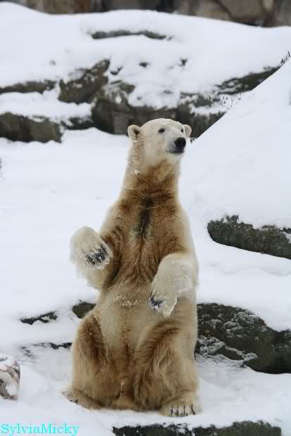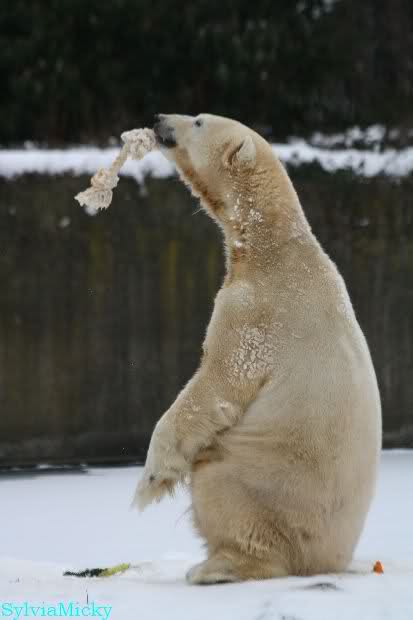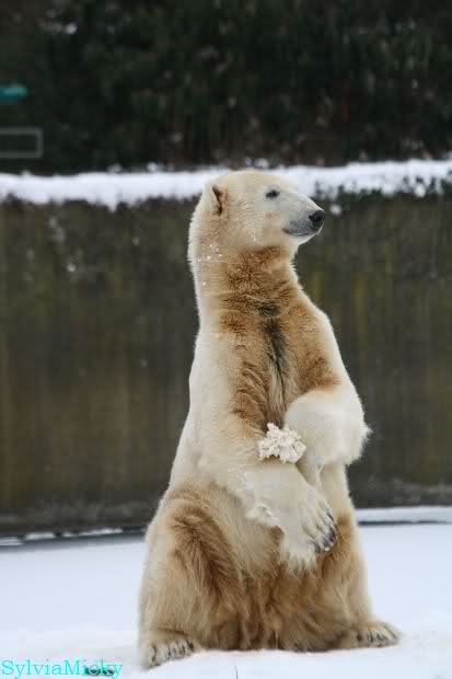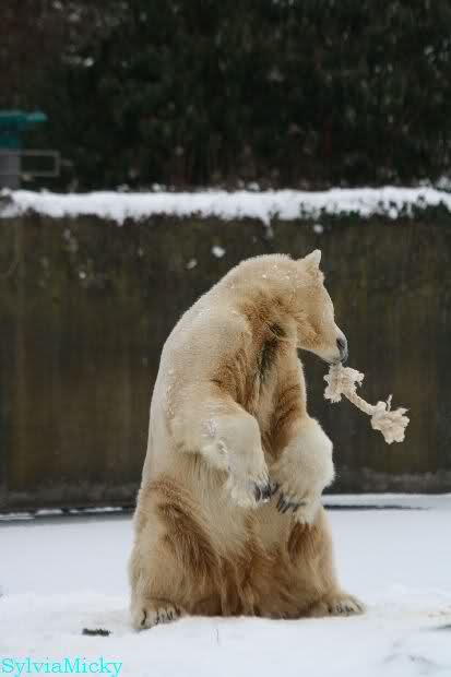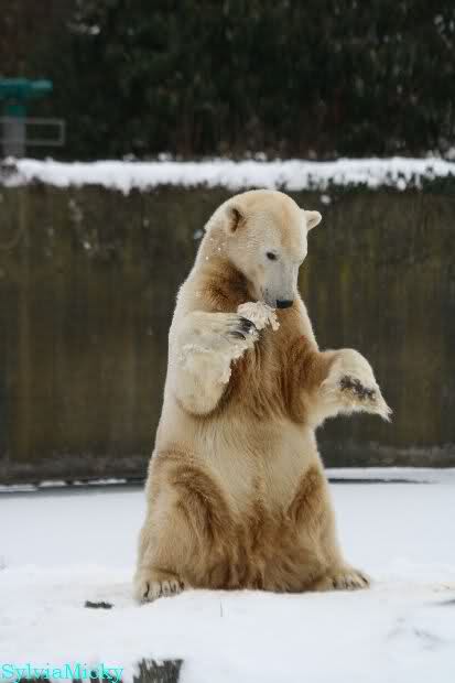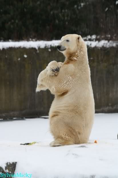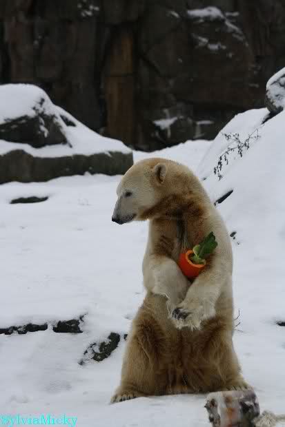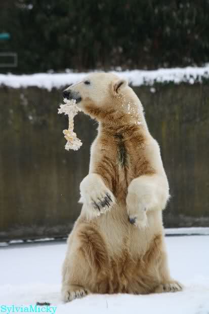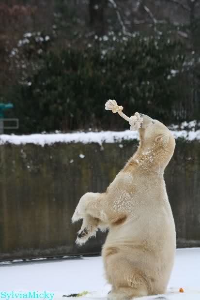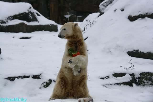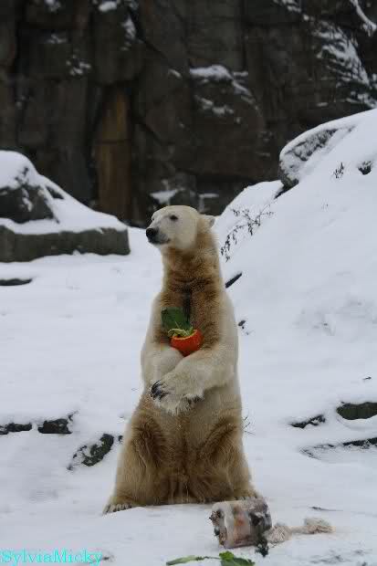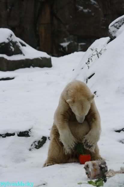 Danke Monika für deine Fotos, sie waren die ersten heute, die ich gesehn habe, ich liebe diese Kombination aus Knut, Schnee und Geburtatgskuchen...