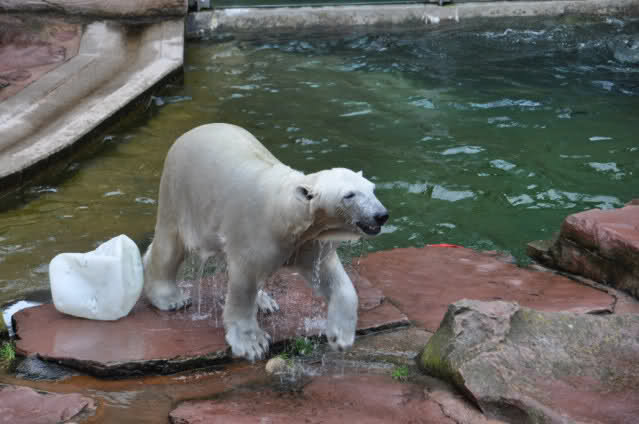 Flocke ist dann eingeschlafen und wir haben eine Runde durch den Tiergarten gedreht. Rechtzeitig zur Fütterung waren wir wieder da; Flocke hat die Fütterung kaum interessiert. Am Anfang hat sie ein paar Stücke Fleisch gefressen, aber nur, wenn sie sich dazu nicht allzusehr bewegen musste. Sie hat dann angefangen an ihrem Kanister zu nuckeln. Nur als ein paar Fleischstücke so geworfen wurden, dass sie getroffen oder fast getroffen wurde, hat sie sie dann gefressen. Rasputin hat das gar nichts ausgemacht, er hat ordentlich gefuttert, irgendwie muss man ja die Figur halten :-).