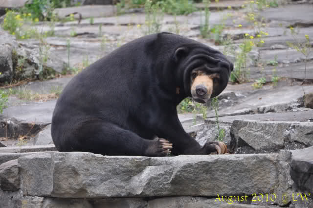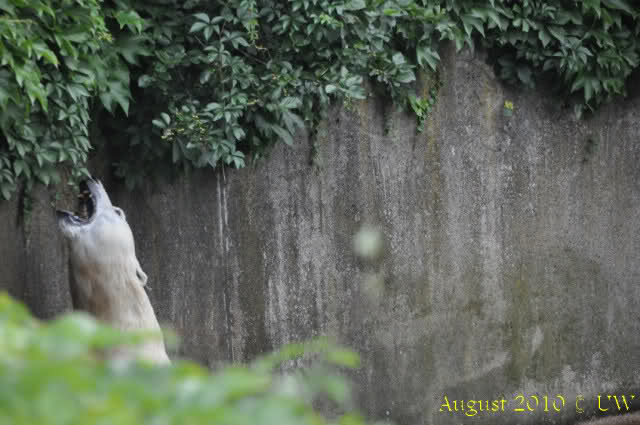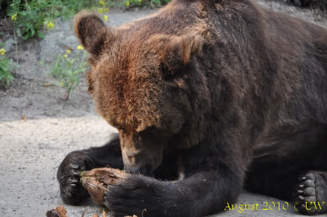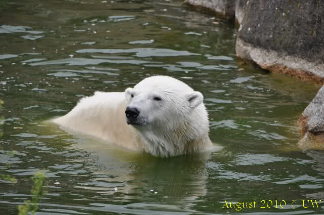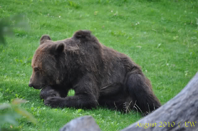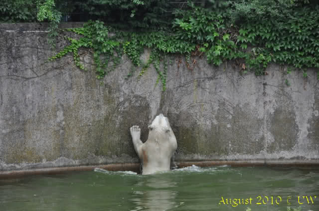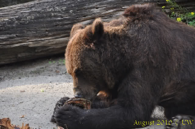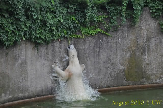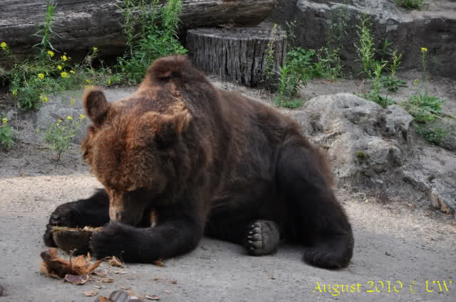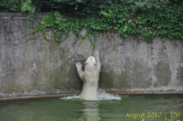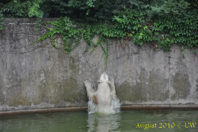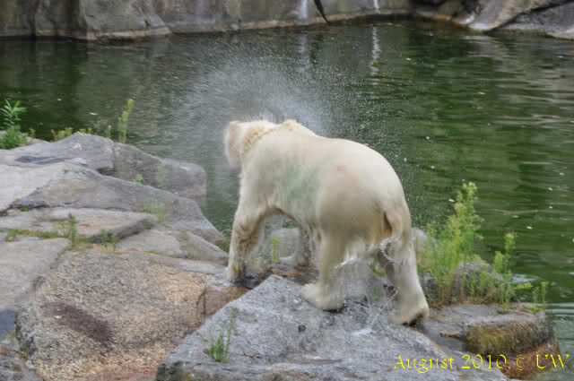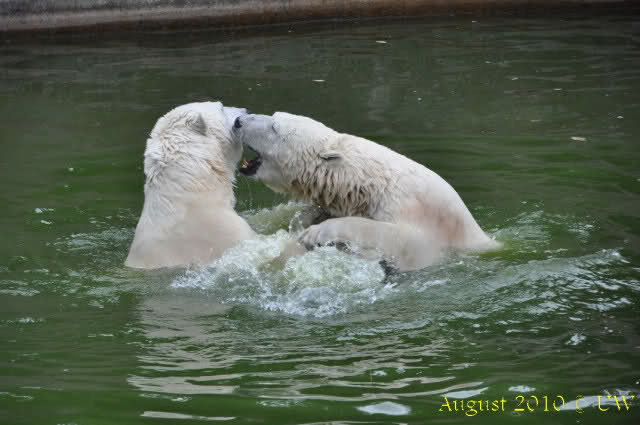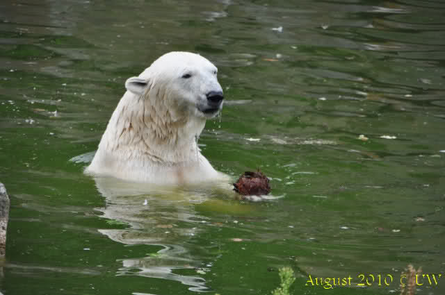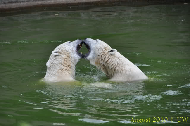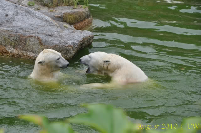 Die folgenden Bilder sind vor der Fütterung aufgenommen, die Bären spielten miteinander, holten sich herunterhängende Zweige und fanden im Wasser auch eine Kokosnuss.