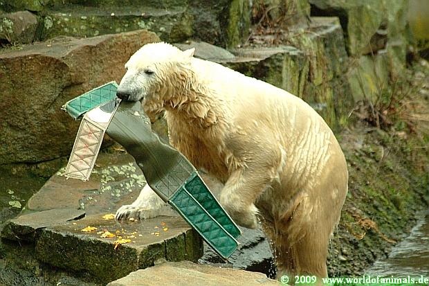 Knut sperrt seinen mächtigen Rachen auf, schnappt sich die Weintrauben, die ein Pfleger über den Gehegegraben geworfen hat.