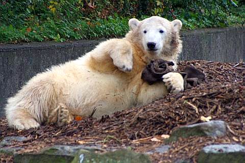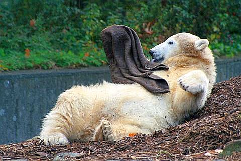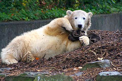 Knut-Fotos heute: Sie zeigen King Knut auf seinem Mulchbett und er spielt mit seinem Knuddel-Jutesack. Auch diese Bilder stammen wieder von Ursula Spenke. Vielen Dank für die Bereitstellung.