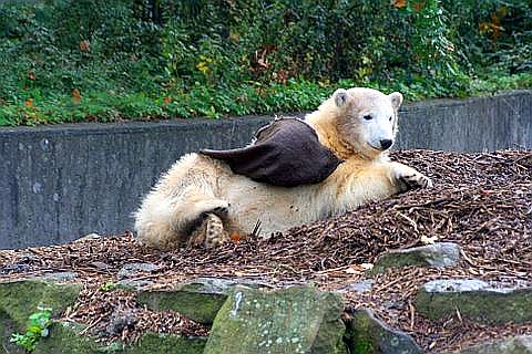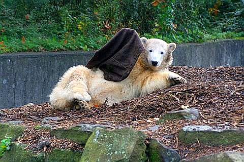 Some more Knut pictures today. King Knut on his *bed* playing with the jutebag. Picture shots from Ursula Spenke. Enjoy.