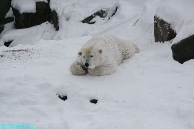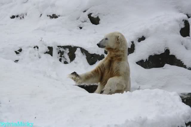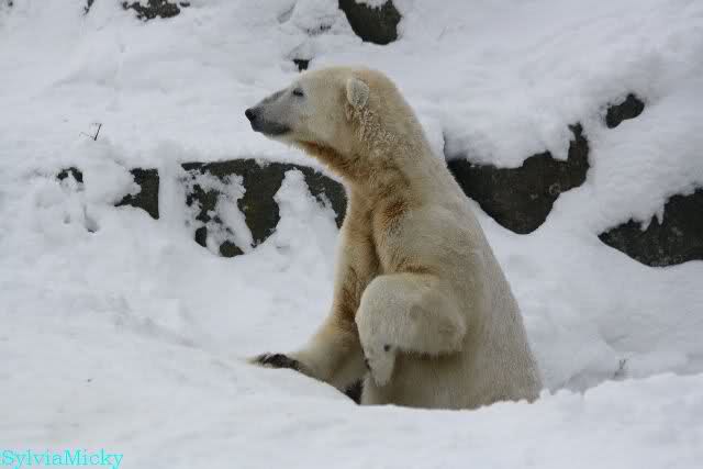 Dann kam eine weitere große Leidenszeit in seinem jungen Leben: Der Umzug auf den großen Eisbärenfelsen. Ich gebe zu, es gab Momente da ertrug ich den Anblick des leidenden Bären nur sehr schwer. Und er hat gelitten. Plötzlich ohne Beschäftigungsmaterial zu sein, sich drei großen Eisbärinnen gegenüber zu sehen, die es ihm nicht leicht machten. Auf nacktem Felsen den Tag zu verbringen, kein Baum, kein Sand, kaum Grünzeug... Aber ihm blieben seine Pfleger, die vertrauten Gerüche, das Umfeld, seine treuen Fans...