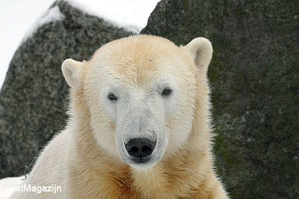 What intrigued me during my december visit, is how often Knut looked at his visitors. But when I looked more precisely at my photo's, I noticed that often it only looks like Knut is gazing at his visitors. His eyes wander very quickly from visitors to rocks to food to twigs to his lady bears to ... whatever!