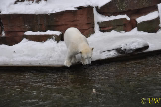 Flocke überlegt, ob sie ins Wasser soll, um den Leckerbissen heraus zu holen