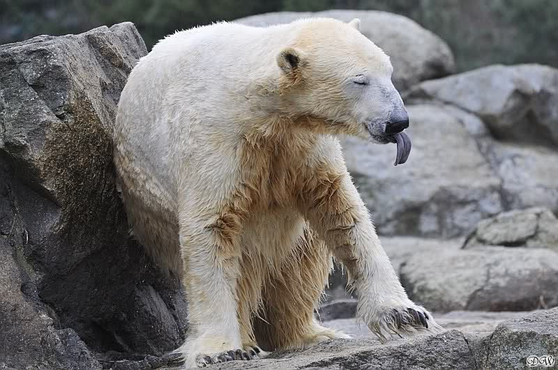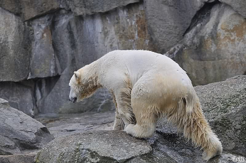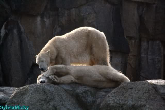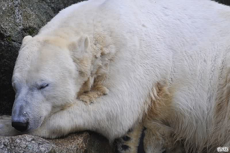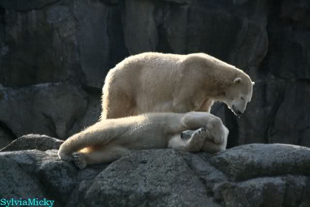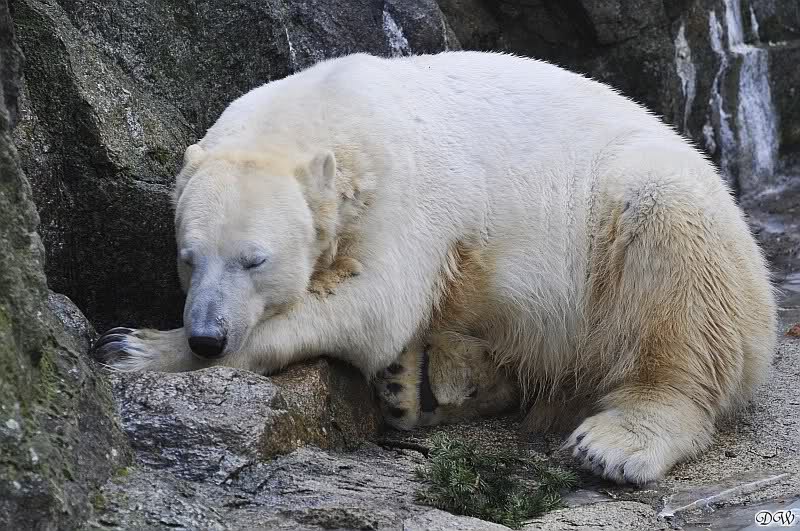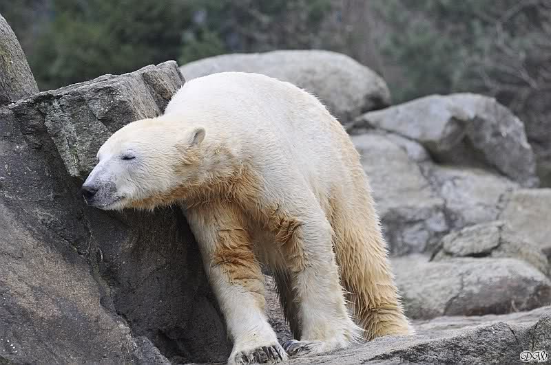 Ja, Knut hat heute viel geruht nachdem er eine Weile mit Tosca gespielt hatte (wie Monika schon berichtete). Nachdem die Mädels drinnen waren, friemelte Knut erst ein wenig vor sich hin. Immer noch auf der rechten Ecke, die ja von vielen als Opferplatz angesehen wird. Dem ist nicht so. Wie auf der alten Anlage auch, hat er sich hier drei Plätze ausgesucht, die er laufend frequentiert. Der Unterschied liegt im Komfort. Hatte er auf der alten Anlage eine Sandkuhle, so hat er hier nur Felsen. Das gilt nicht nur für ihn, sondern auch für die anderen Bären. Schön ist es für keinen.