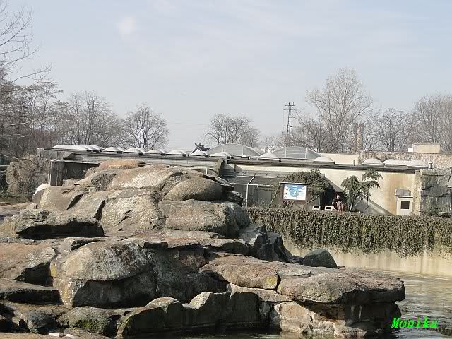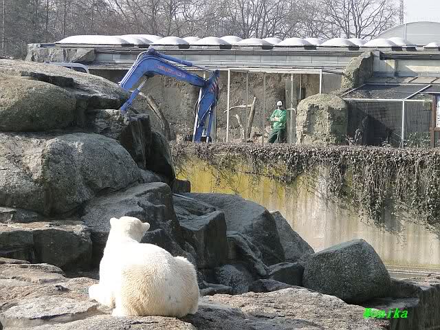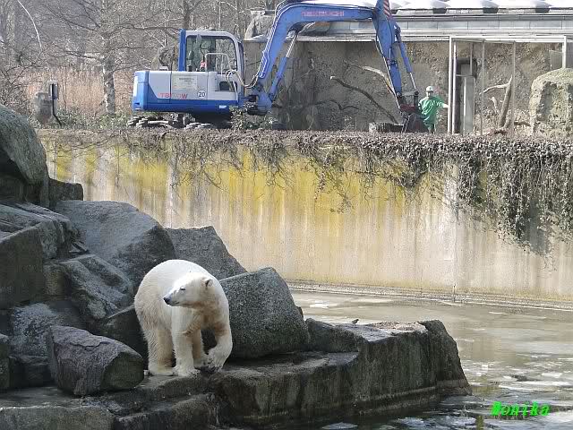 Tosca ging nach der Fütterung wieder ins Wasser und suchte die Reste. Knut ging wieder in seine hintere Ecke. Inzwischen wurde auch der letzte Baum gefällt. Als dann ein Bagger dicht ans Gehege fuhr, kam Knut nach vorne auf das mittlere Plateau, wo er mittags noch lag und die Arbeiter beobachtete.