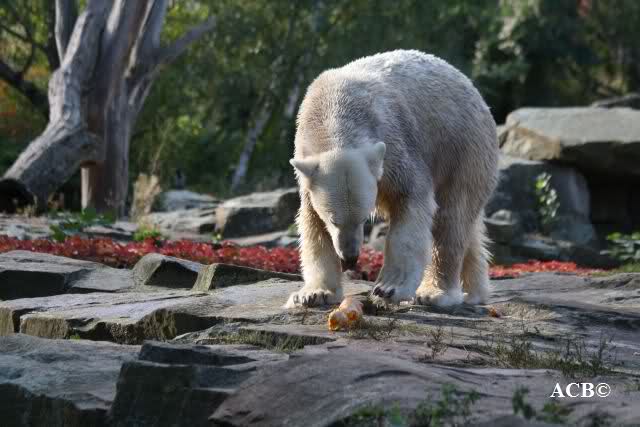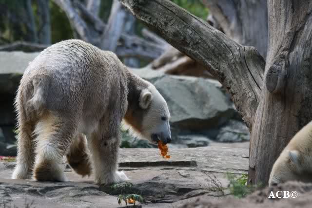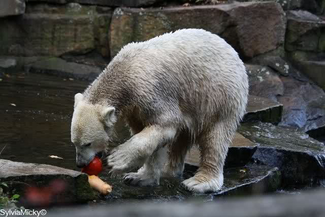 Eine Besucherin erzählte mir, daß sich Gianna seinen Ball aus dem Wassergraben nahm, einmal über die Anlage lief und dann den Ball zu Knut warf.