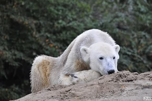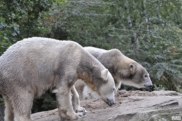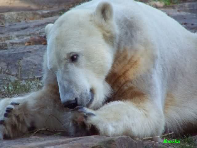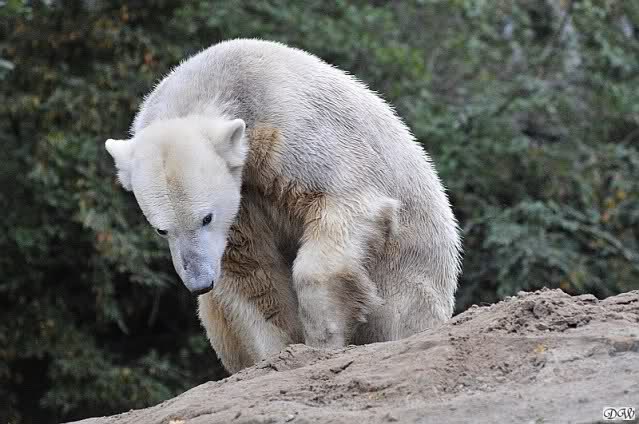 Als wir am späten Nachmittag bei Eiseskälte im Zoo ankamen, war Knut platt! Er lag auf seinem Sandhaufen und war sehr müde. Gianna, die heute ihr schneeweißes Fell nach Knut-manier eingefärbt hatte, hingegen nicht. Sie suchte Kontakt - und sie trieb den armen müden Knut die Wand hoch, oder besser gesagt, vom Sandhaufen hinunter. Wieder und wieder. Es war ein ständiges Ringel, Ringel, Reihe spielen. Knut's Lippe wurde von Zeit zu Zeit immer länger. Wenn sie ihm den Rücken kehrte, machte er Scheinangriffe (sie sah es nicht), fühlte sich besser und legte sich wieder hin. Dann ging es von vorn los: Ring around the Rosy!