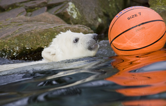 Flocke liebt es zu schwimmen! In ihrem neuen Freigehege hat sie ein richtig großes Schwimmbecken mit kleiner Felseninsel in der Mitte. Da lässt es sich wunderbar planschen. Und wenn dann noch ein Ball dazu kommt, ist das Spielvergnügen perfekt. (Foto: Ralf Schedlbauer)