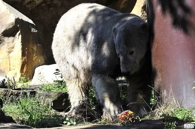 Hello to you all Knut friends around the world at evening on Germanys hottest day in year. It was a very very hot day with very high temperatures. Not good for our polar bears. Knut got a *ice bomb* with fruit and vegetables. We don´t know the big polar bears got *ice bombs* too.