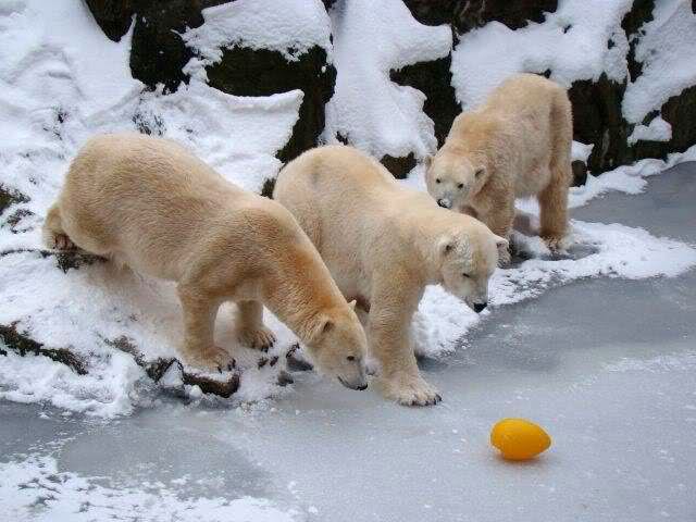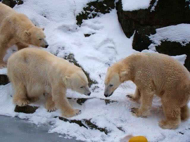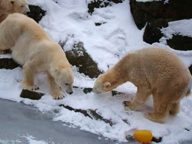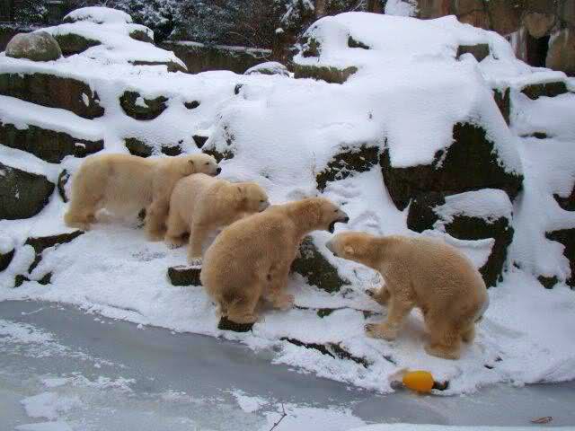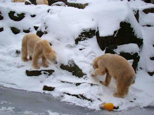 „Eisbären lieben die Kälte zwar nicht unbedingt, aber mit Schnee und Eis können sie immer was anfangen“, lachte Zoo-Biologe Ragnar Kühne. Und wie seine vier Petze etwas anfangen konnten! Vergnügt wälzten sich Tosca, Nancy, Katjuscha und Knut im Schnee, brachen mit den Vorderfüßen die Eisschicht in ihrem Wasserbecken. Übrigens: Am Sonntag feiert Besucherliebling Knut seinen vierten Geburtstag. Zwar soll es dann wieder wärmer werden – gegen die Plusgrade gibt’s aber eine prall gefüllte Eisbombe.