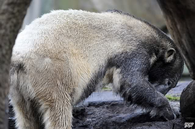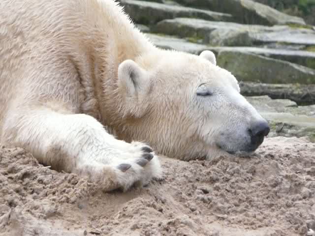Als ich heute Nachmittag in den Zoo ging ruhte Knut auf seinem Sandhaufen. Von sehr netten Knutfreunden aus Stuttgart bekam ich von der Frühschicht vermittelt, daß Knut lange im Wasser mit seinem Nackthuhn spielte und sehr munter war. Danke dafür.