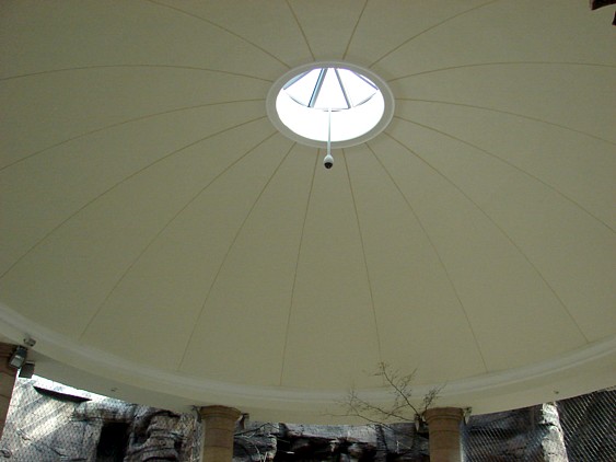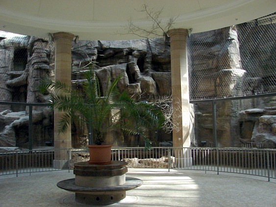 Wer das alte Haus kennt, weiß ja, wie es dort ausgesehen und vor allem gerochen hat. Davon ist nichts mehr übrig. Man betritt einen wunderschönen Raum, der mich durch das weiße Kuppeldach, das auf den renovierten Sandsteinsäulen aufliegt, sofort an einen Tempel erinnert hat. Es gibt keine Gitterstäbe mehr, sondern unten Glaswände und oben Stahlseilnetze. Die Rückwände sind aus Sandstein, teils Natur, teils nachgebildet, ich als Laie kann gar nicht sagen, was da echt ist und was nicht. Und auf dem Boden der Gehege gibt es keine Fliesen mehr, sondern Rindenmulch. Angeblich lässt sich das trotzdem so reinigen, dass es nicht mehr stark riecht, da bin ich gespannt. Aber schlimmer als vorher kann es kaum werden Die Tiere können sich in den oberen Teil der Gehege zurückziehen, so dass man sie von unten nicht sieht, wenn sie keine Lust auf Publikum haben. Die Tiger hatten gestern tatsächlich keine, außer mal einem Fuß war nichts zu sehen. Aber das war mir nicht wirklich wichtig, Hauptsache ist, dass alle vier Raubkatzen wieder da sind und die lange Zeit auswärts gut überstanden haben. Immerhin ließ sich Thar, der Löwenmann, an der Scheibe blicken, während seine Gefährtin Keera von oben das Geschehen betrachtete und sich dann irgendwann zu einem Schläfchen zurückzog.