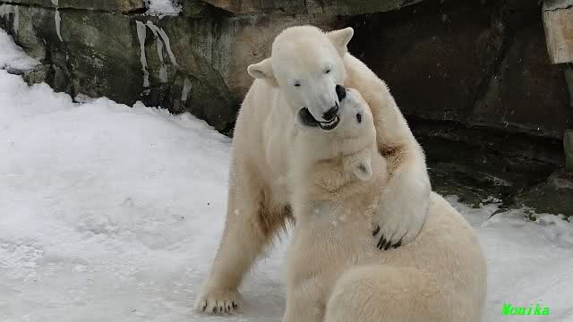 Bei leichtem Schneegriesel wurde heute endlich wieder geschmust und gespielt. Knut ging (rutschte) heute ziemlich schnell nach unten zum Pool und kratzte ausdauernd am Eis, um festgefrorene Federn zu bekommen. Dann lag er lange in der kleinen Höhle am Pool. Gianna machte es offensichtlich Spaß, Knut von oben Schnee auf den Kopf rieseln zu lassen.
