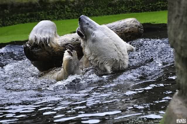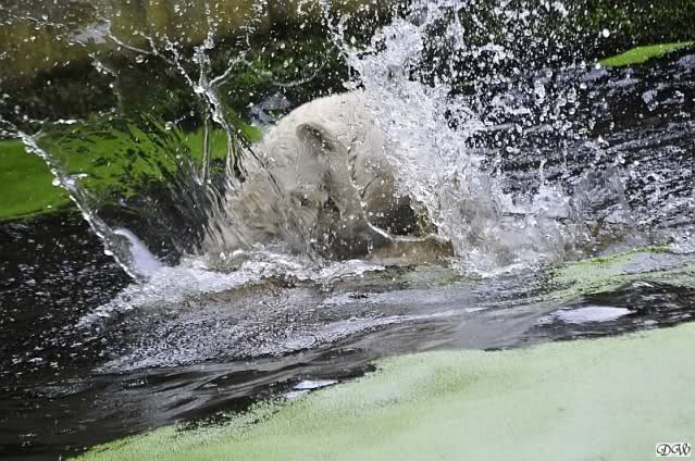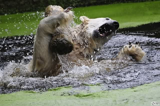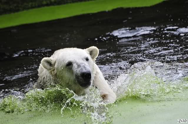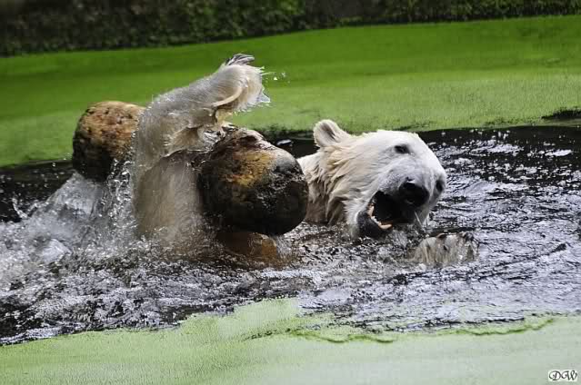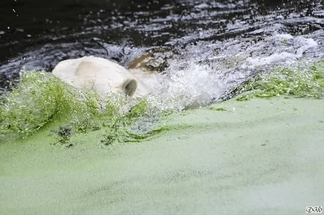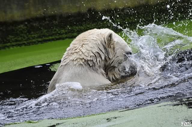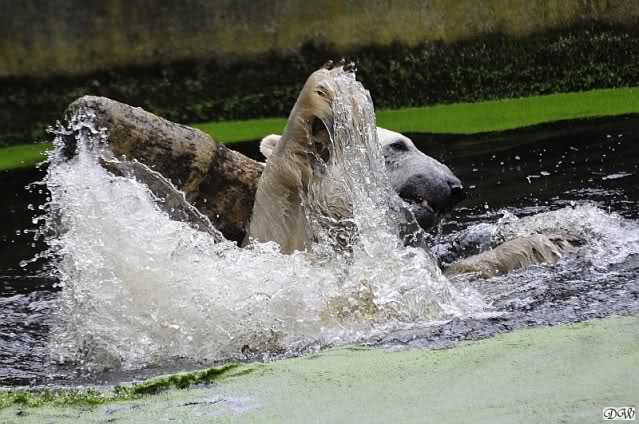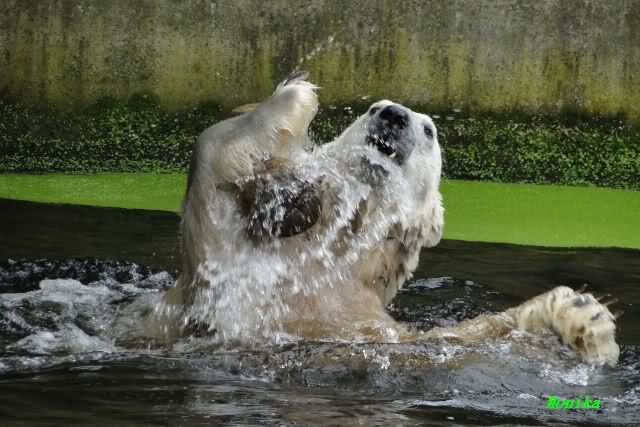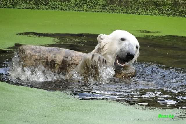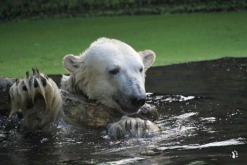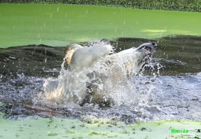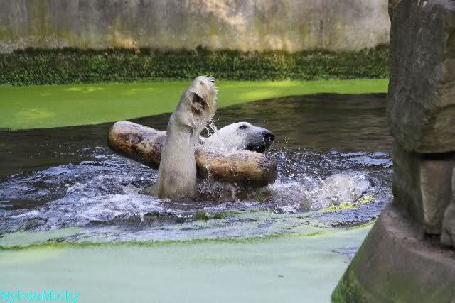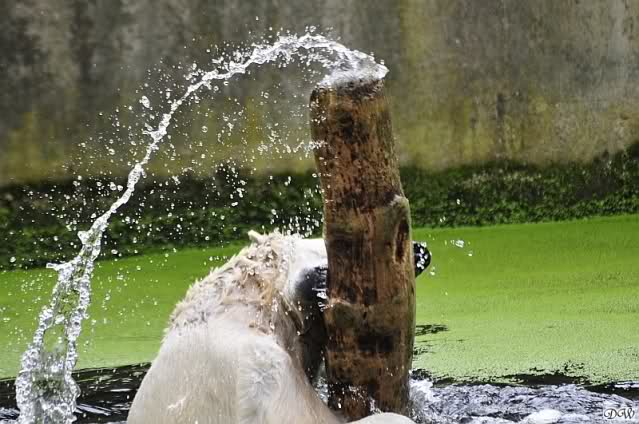 Knut war heute Morgen schon im Wasser und tobte lange ausgelassen mit seinem Baumstamm und dem Schlauch. Der Ball wurde auch wieder zu den Besuchern geworfen.
