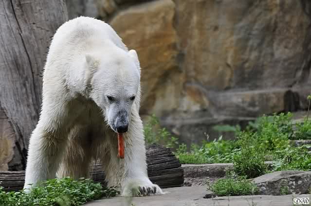 Knut hatte einen guten Tag. Er tobte im Wasser, friemelte mal mit seinem Zweig, mal mit einer Pflanze, die er ausgerissen hatte. Im Wasser spielte er wieder so intensiv, dass Frau Weckert ihn zweimal rufen musste. Als er sie endlich hörte, legte er einen Spurt hin, der ihm bestimmt eine Medaille gebracht hätte. In aller Ruhe suchte er seine Anlage ab und sammelte die nun nicht mehr rationierten Möhren ein. Ein paar lies er bis zum späten Nachmittag übrig und verspeiste sie dann. Ab und zu gab es ein kleines Schläfchen nur um dann wieder mit Stock und Pflanze zu spielen.