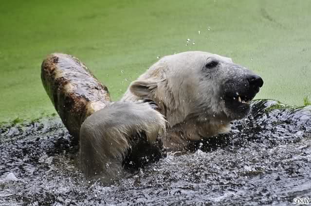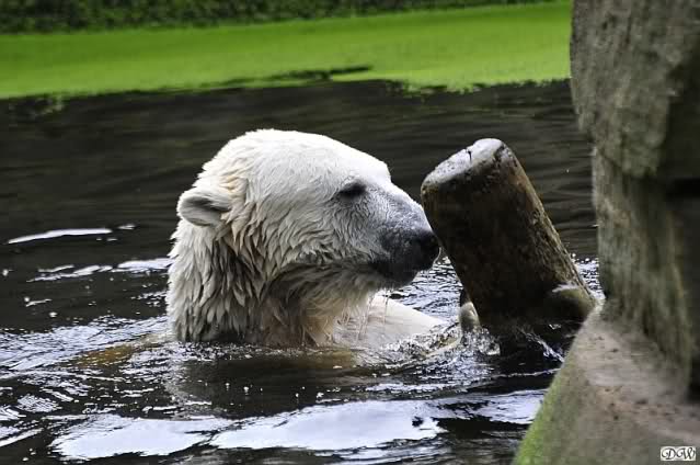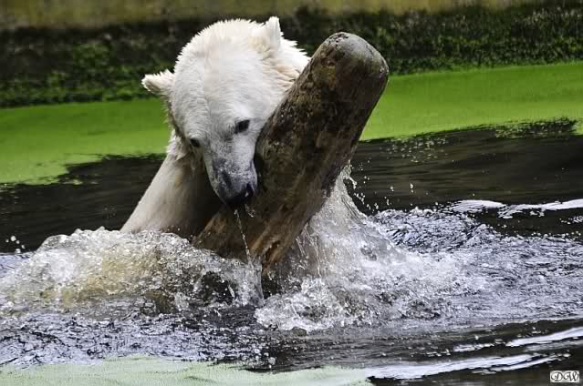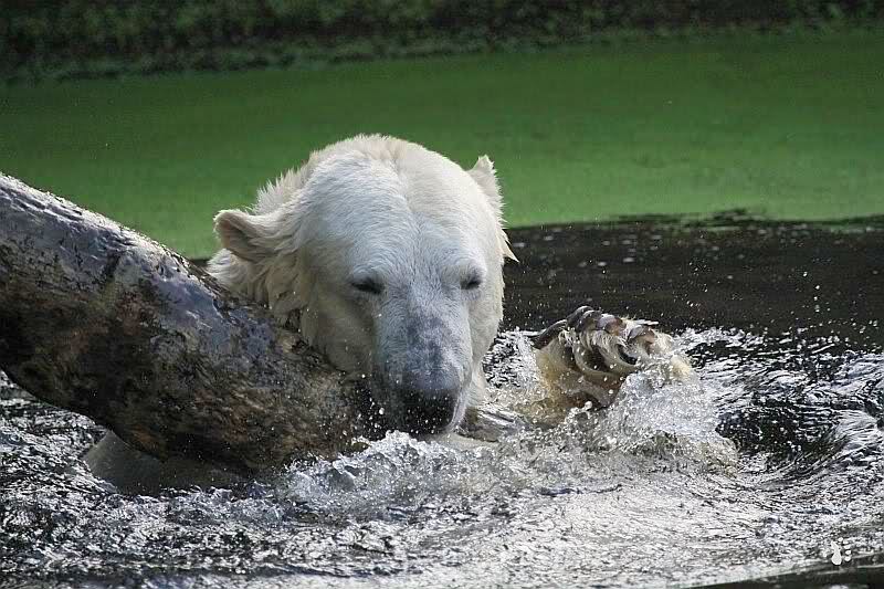 Heute früh tobte Knut den ganzen Vormittag im Wasser mit dem Baumstamm. Was für eine Ausdauer.