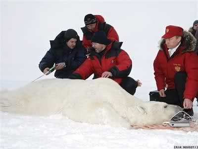 Wladimir Putin hat eine neue Kostprobe seiner Berufung zum Abenteurer gegeben. Als Öko-Krieger half er Wissenschaftlern in der russischen Arktis dabei, vom Aussterben bedrohte Eisbären aufzuspüren und mit Peilsendern zu versehen. Angetan mit einem roten Mantel und roter Mütze kniete sich der 57-Jährige neben den Kopf eines betäubten Eisbären, dem ein Sender angesteckt wurde, und half dabei, das schwere Tier zu wiegen.