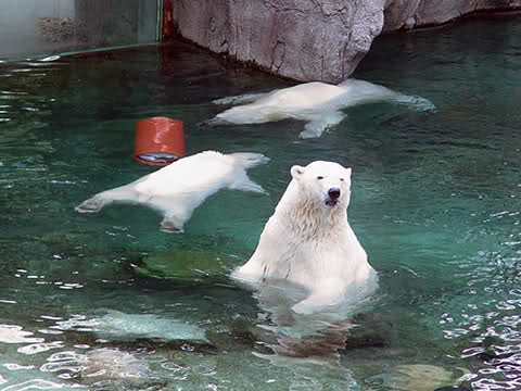 Nach ein paar Stunden schwammen die drei Bären gemeinsam in dem großen Becken. Alles in allem scheint es, dass die drei Eisbären miteinander können und sie sich vertragen in der nun viel größeren Anlage.