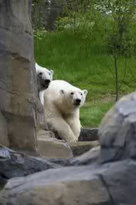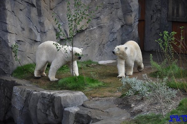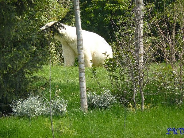 Endlich sahen wir die Eisbären. Die Anlage ist riesig. Sie ist geteilt in zwei Teile. Sprinter wohnt links, die Zwillinge wohnen auf der rechten Seite. Das Wasser ist natürlich und deswegen etwas bräunlich. Ein Generator produziert Wellen wie im Ozean. Die Bären haben eine große grüne Fläche mit kleinen Bäumen, Sträuchern und Tannen. Leider haben wir kein Spielzeug gesehen. Sprinter schlief Vormittag. Die Zwillinge liefen unruhig hin und her.