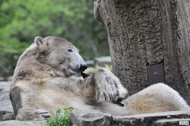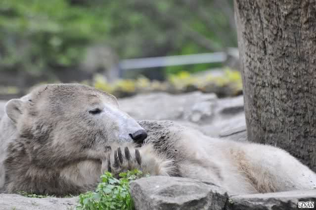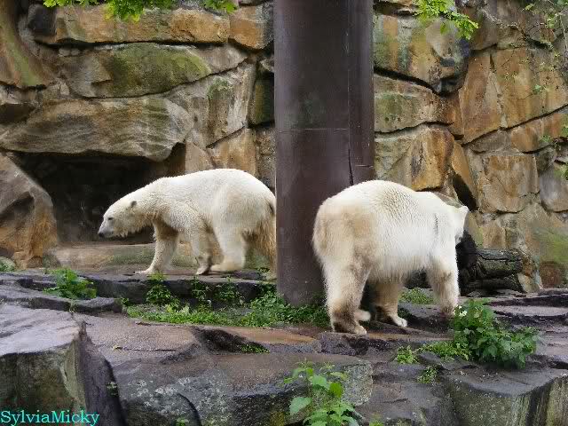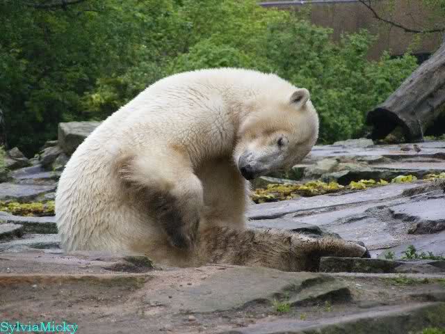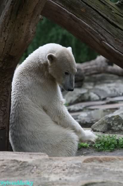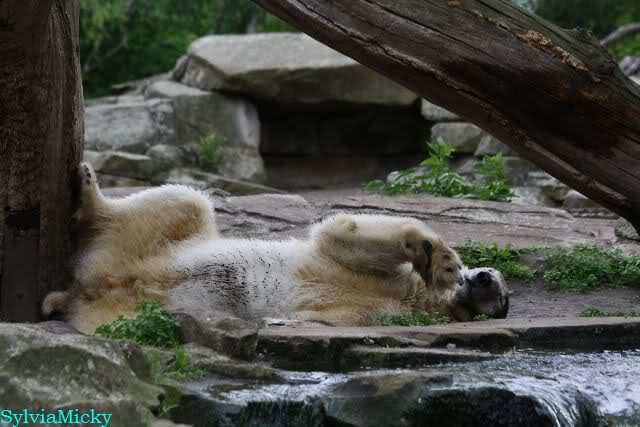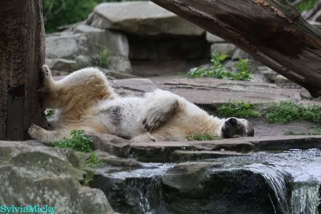 Gegen Mittag schliefen beide. Leider gab es wieder Besucher, die Knut wach rufen mußten. Das Ergebnis war, er lief. Dann sagten die gleichen Besucher: er läuft ja nur, armer Knut. Au weia.