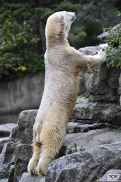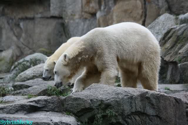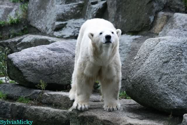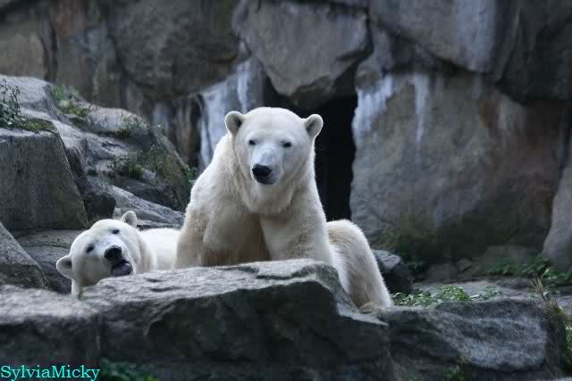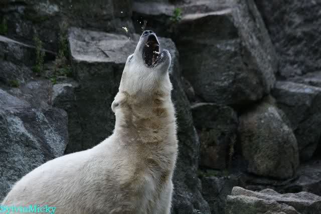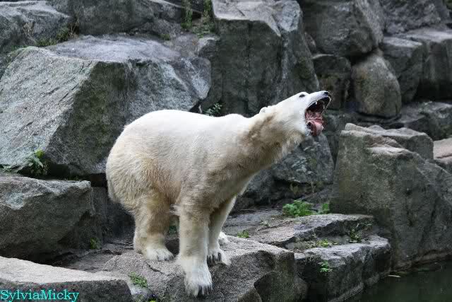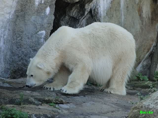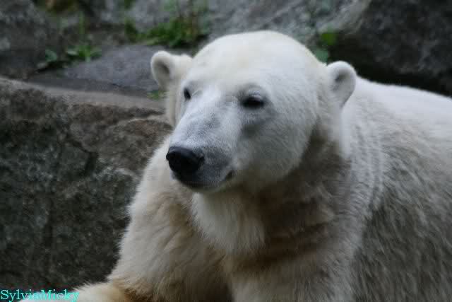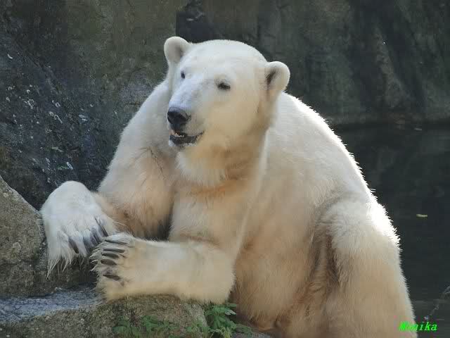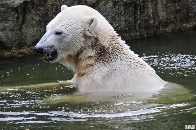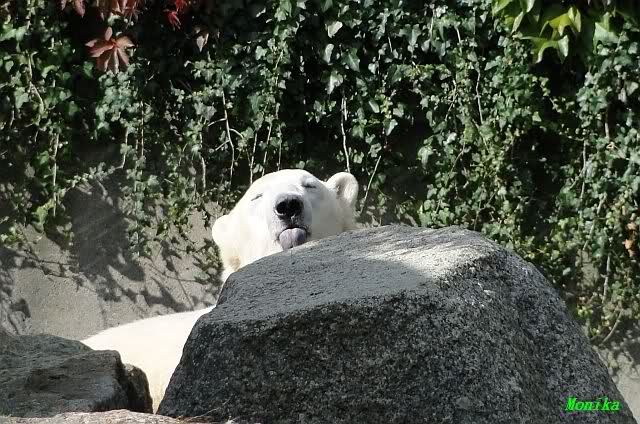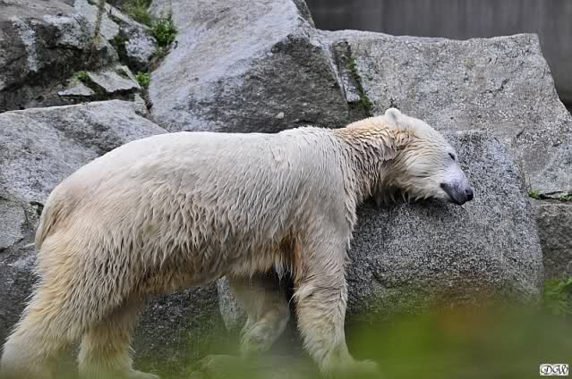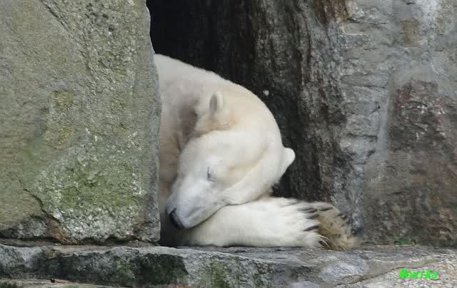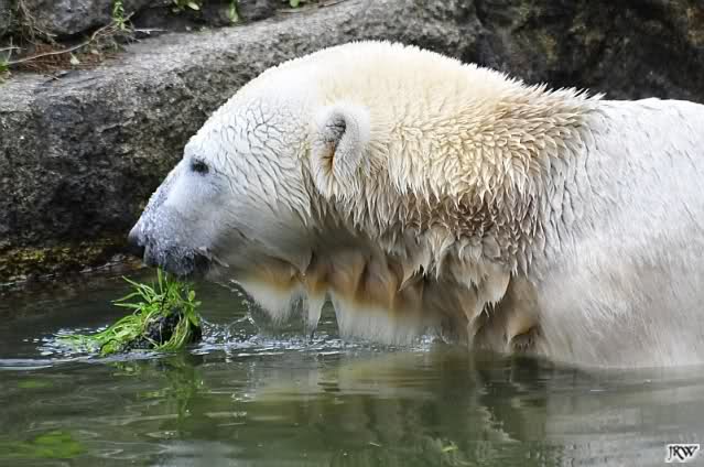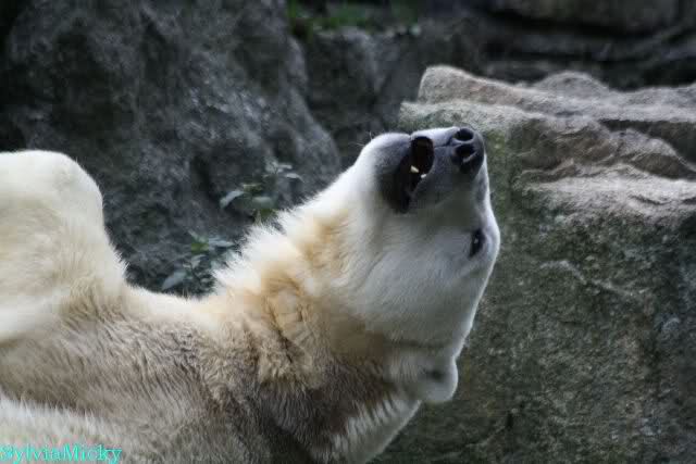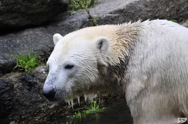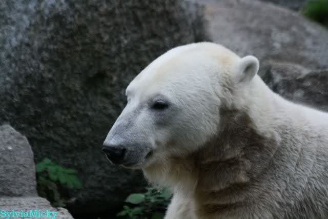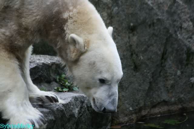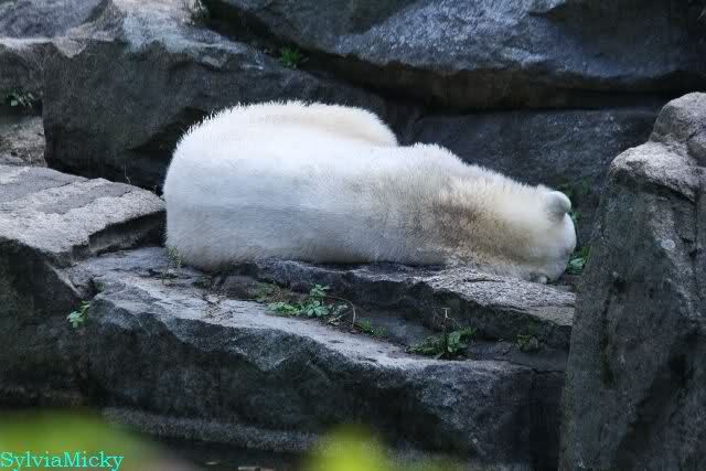 Heute früh lag Knut wieder auf dem rechten Felsen und schlief. Gefüttert hat heute Frau Weckert. Tosca war nur im Wasser und fraß und fraß.