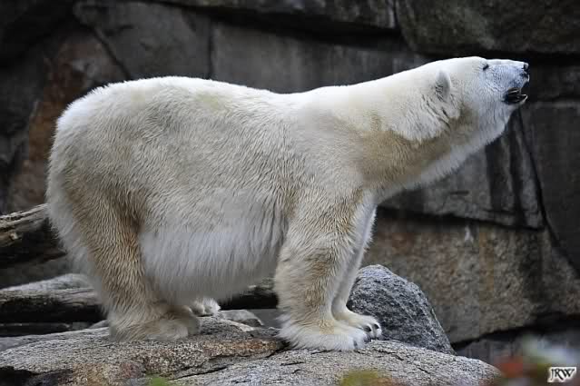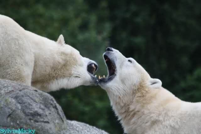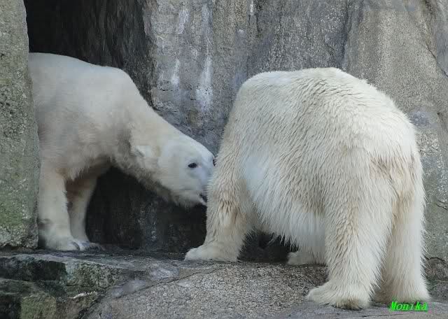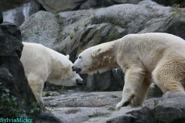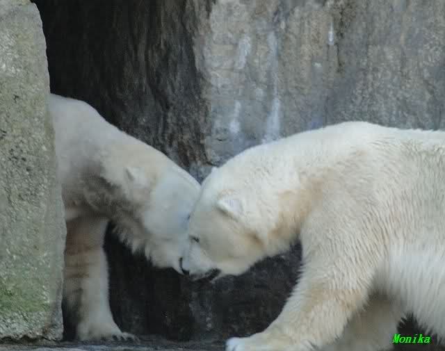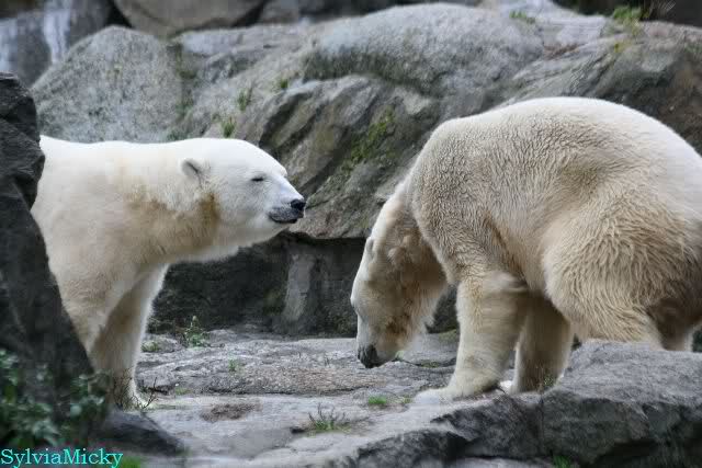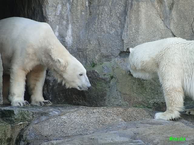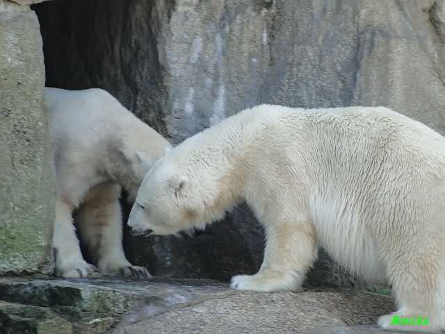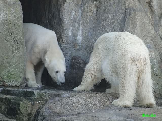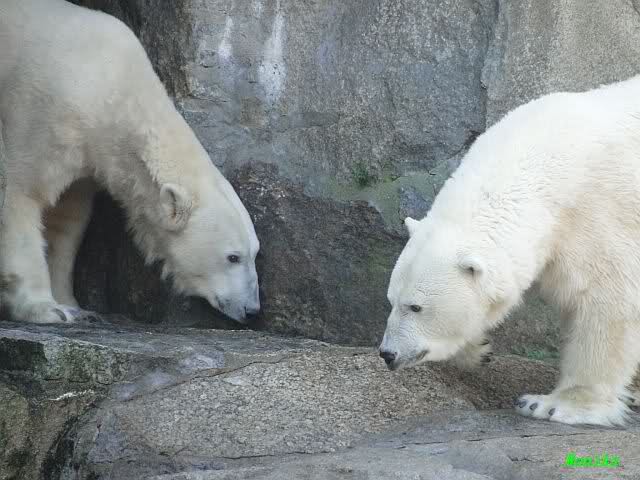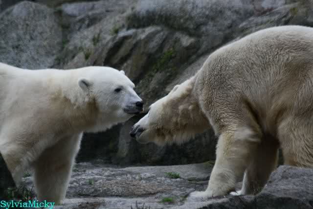 Nach der Fütterung kamen Nancy und Kati um die Ecke zu seinem Felsen. Knut ging dann auf die Anlage und stand vor Katis Höhle. Dann kam Tosca. Sie beschnupperten sich. Ohne Maul aufreißen und ohne brummen. Sie standen sich dann für eine ganze Weile völlig regungslos gegenüber. Es war faszinierend dies mit anzusehen. Knut hatte Tosca immer im Blick. Irgendwann ging Tosca weg.