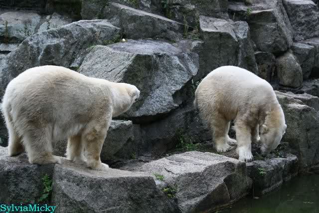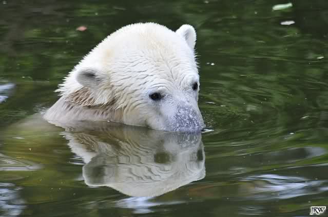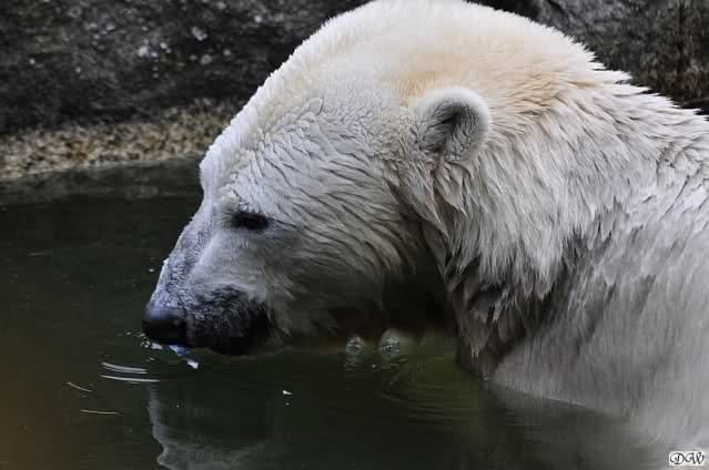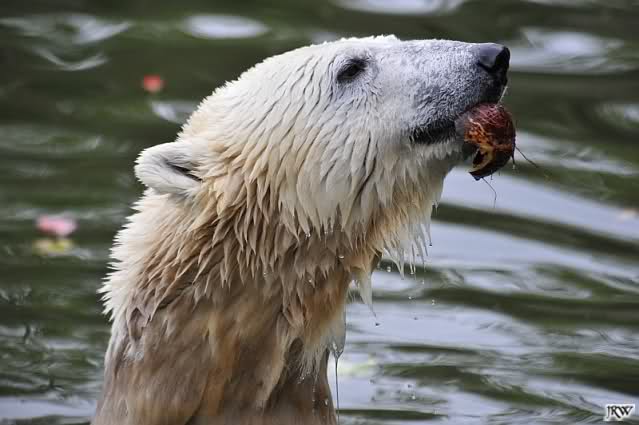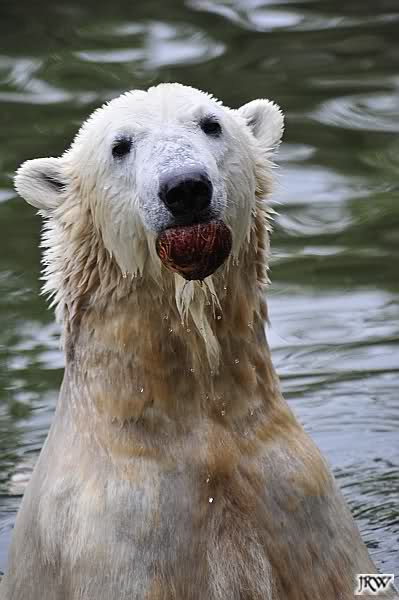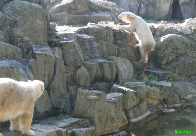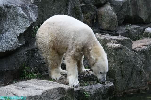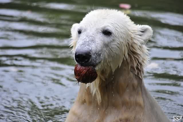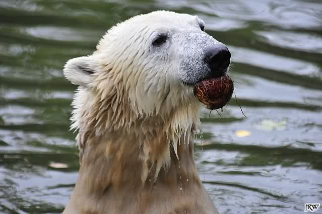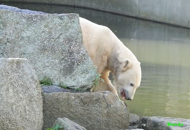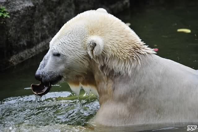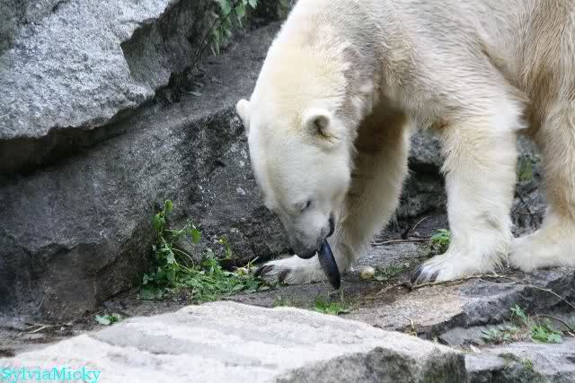 Hier sind noch einige Bilder von gestern. Es war nachmittags friedlich zwischen den Bären. Knut spielte viel im Wasser mit allem was er finden konnte. Irgendein Schwachmatiker hatte einen Kugelschreiber in das Wasserbecken geworfen und Knut spielte glücklich damit. Einige Leute fanden das sehr lustig. Auch Schwachmatiker.
