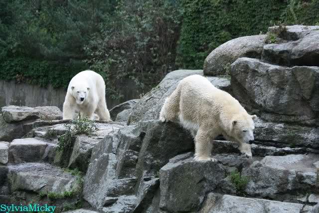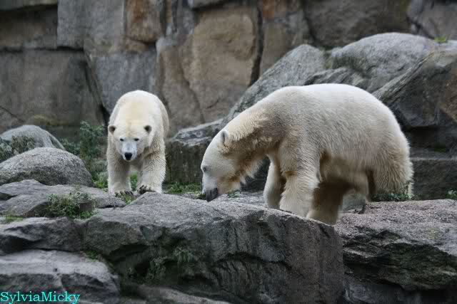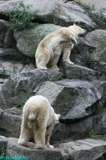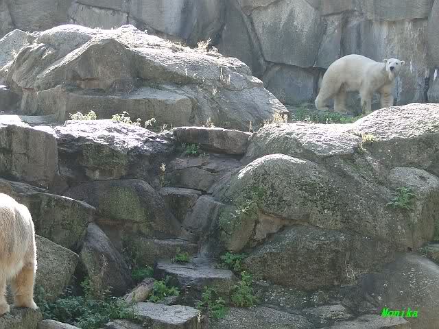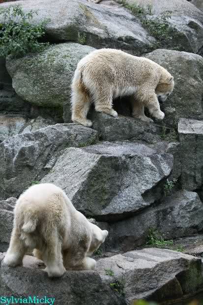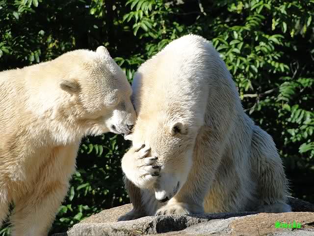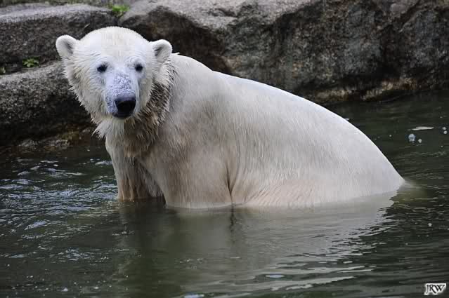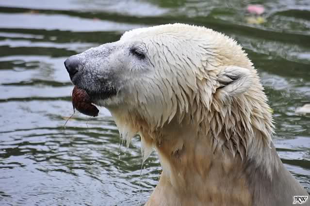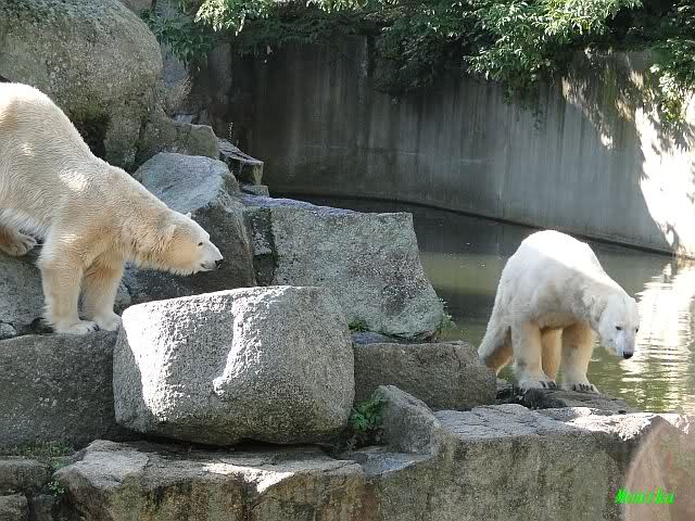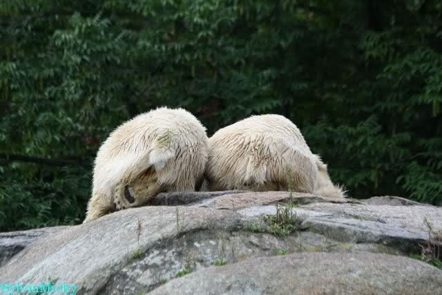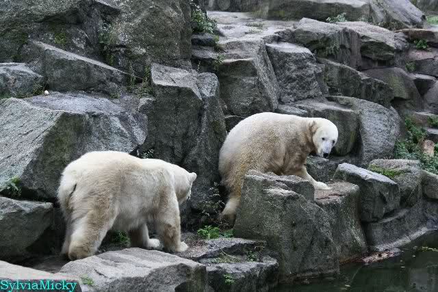 Hier sind noch einige Bilder von gestern. Es war nachmittags friedlich zwischen den Bären. Knut spielte viel im Wasser mit allem was er finden konnte. Irgendein Schwachmatiker hatte einen Kugelschreiber in das Wasserbecken geworfen und Knut spielte glücklich damit. Einige Leute fanden das sehr lustig. Auch Schwachmatiker.
