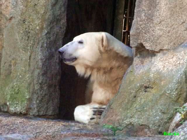 Dafür rächte sich Knut und besetzte Katjuschas Höhleneingang, in dem er den Rest des Vormittags verbrachte. Nicht kampflos, denn Kati versuchte immer wieder die Höhle zurück zu erobern. Aber unser Kleener blieb standhaft und brummte was das Zeug hält. Irgendwann gab Kati auf und überließ Knut ihren Platz. Als ich nach einen Zoorundgang wieder zurück kam, war Knut im Wasser an der Scheibe. Er saß sehr lange ziemlich ruhig im Wasser und sah immer wieder nach oben, als ob er auf Futter hoffte. Es war ja auch seine alte Fütterungszeit und satt ist er heute bestimmt auch nicht geworden. Irgendwann kam er aus dem Wasser und legte sich auf seinen Stammplatz uund schlief.