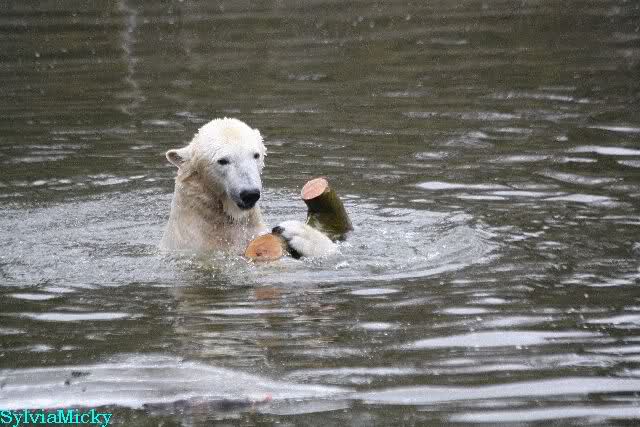 Tosca vergnügte sich derweilen mit einem Baumstamm im Wasser. Ab und zu schaute sie zu Beiden rüber. Sie ging auch zu Knut und Nancy hin. So daß sich Knut und die beiden Bärinnen auf der kleinen rechten Ecke aufhielten. Ich hatte nicht den Eindruck, daß es Knut unangenehm war.