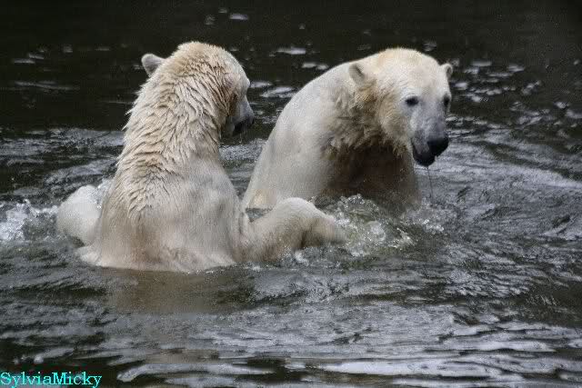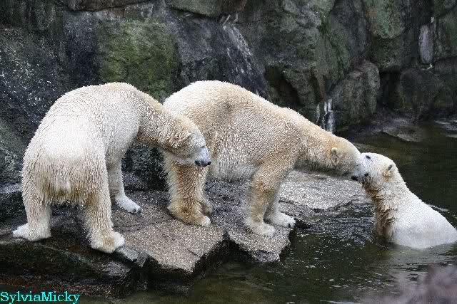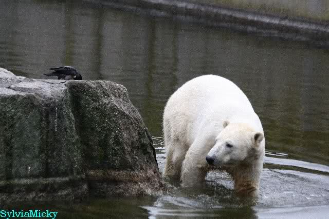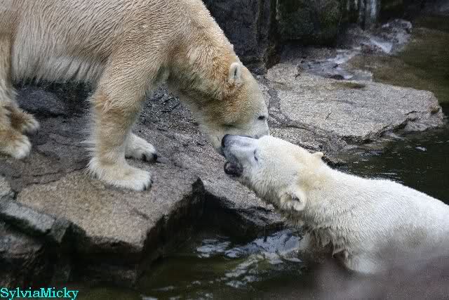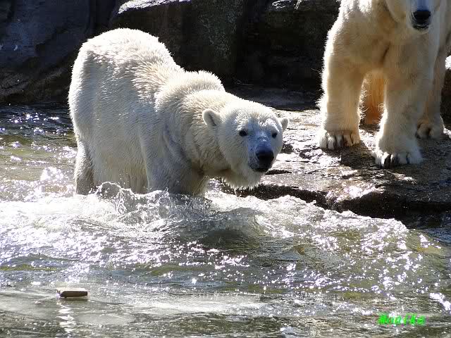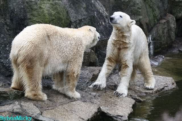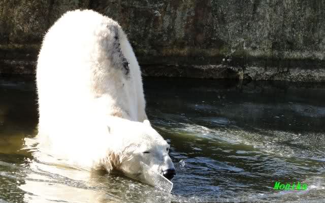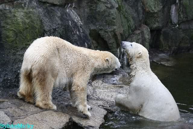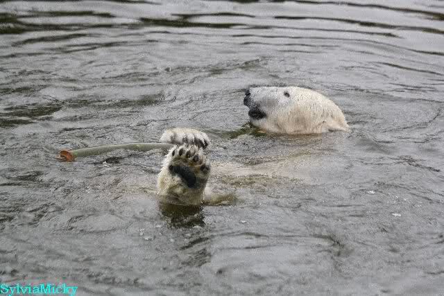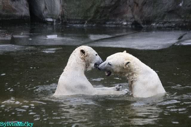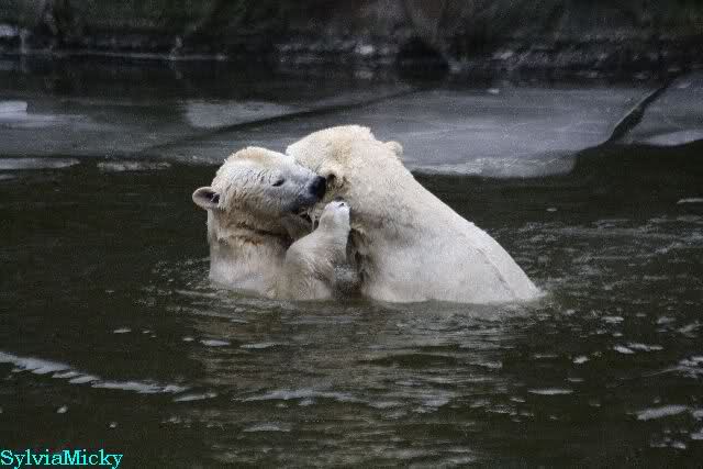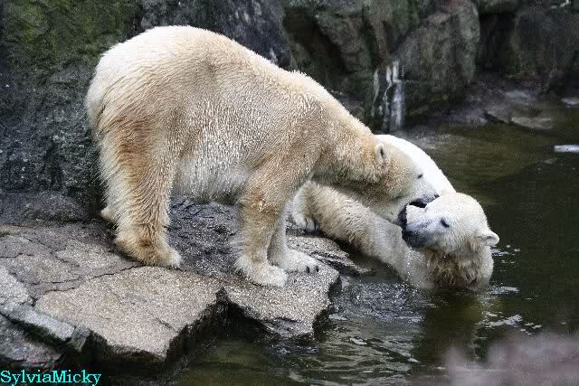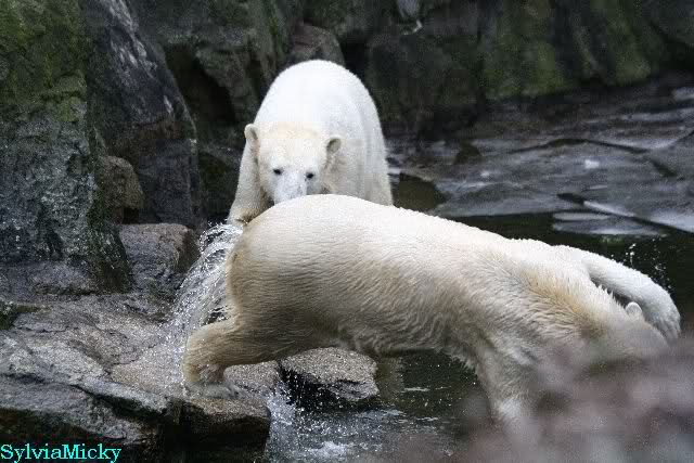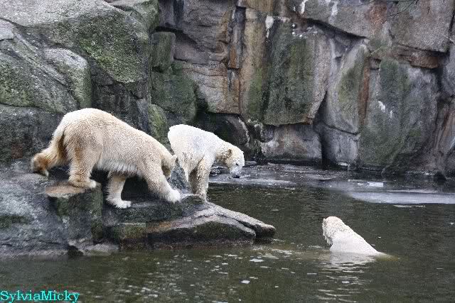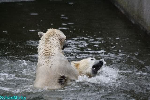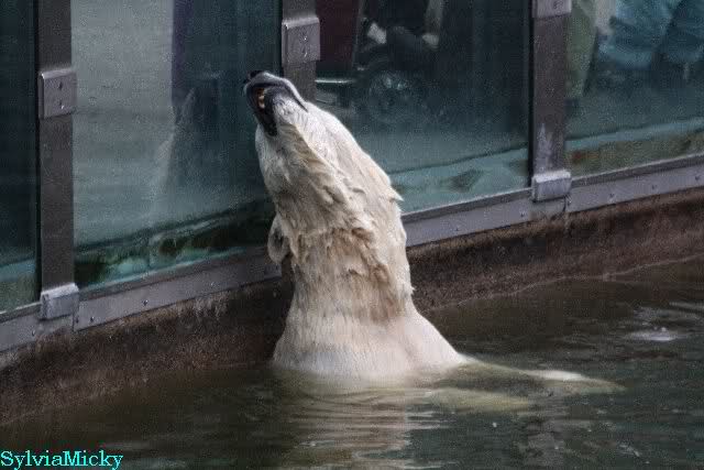 Glück für Tosca, die wieder viel davon abbekam. Aber auch Kati holte sich einige Stücke. Tosca schwamm dann um die Ecke zu Knut und versuchte ihn mit vielen Sprüngen ins Wasser zu locken. Aber irgendwie wollte er nicht. Sie ging dann auf die Anlage und sie „schmusten“ lange zusammen. Dann sprang Tosca wieder mehrmals ins Wasser. Endlich ging auch Knut rein. Und dann tobten sie lange im Wasser. Sie schwammen auch beide an die Scheibe. Sehr zur Freude der Besucher. Nancy beobachtete die Beiden die ganze Zeit. Sie lief ihnen auf der Anlage immer hinterher. Als Knut keine Lust mehr zum toben hatte, ging er auf die rechte Seite. Dann kam Nancy an und sie „schmusten“ sehr lange miteinander. Knut ging ab und zu ins Wasser, als wenn er sie rein locken wollte.