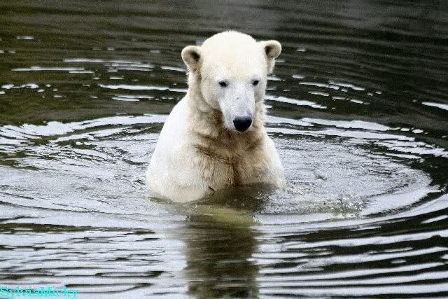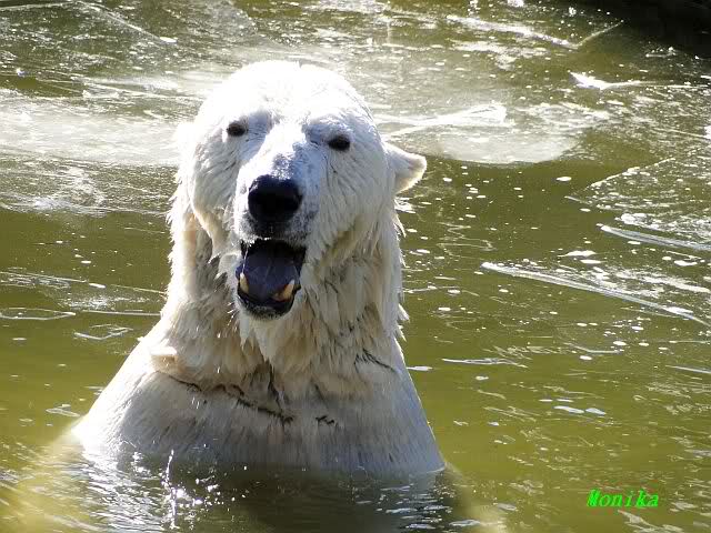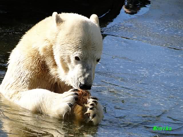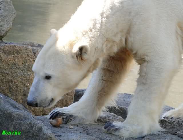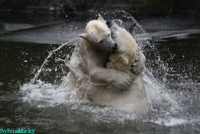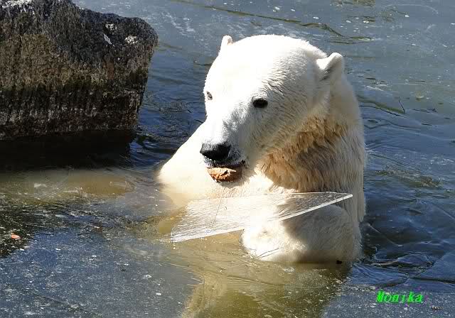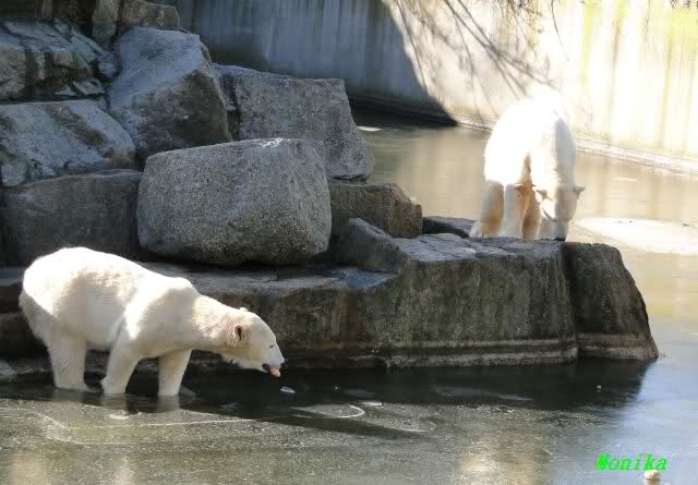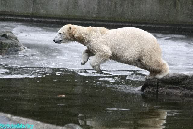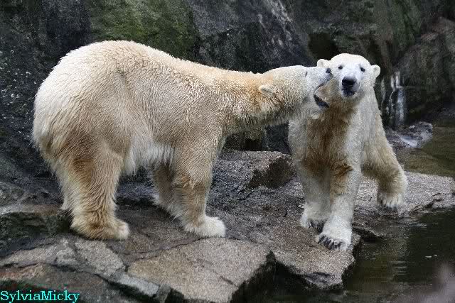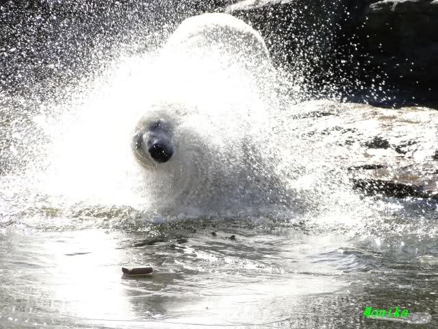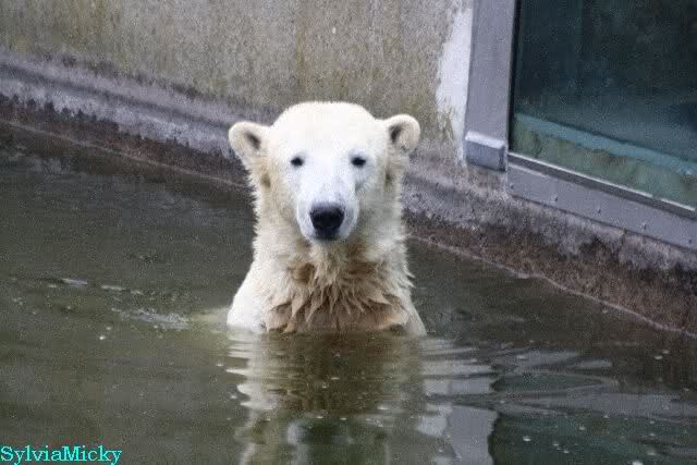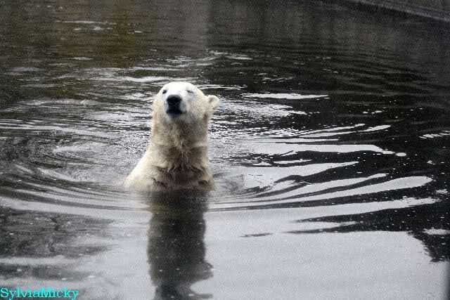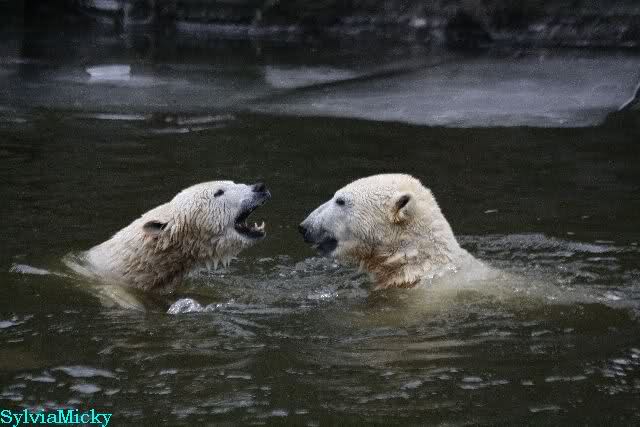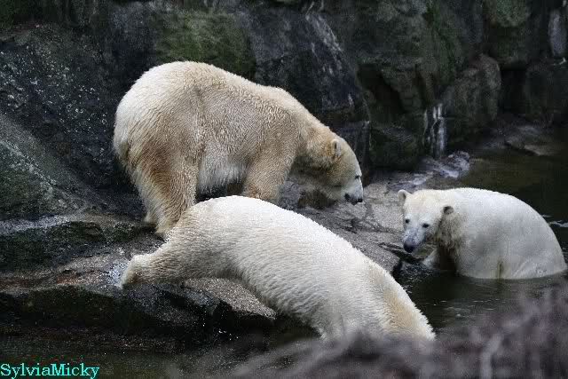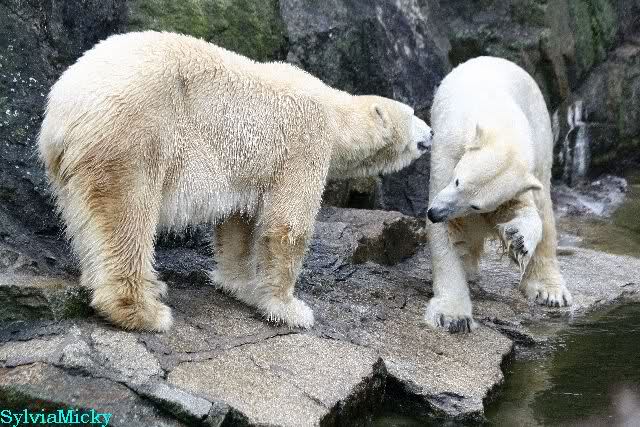 Glück für Tosca, die wieder viel davon abbekam. Aber auch Kati holte sich einige Stücke. Tosca schwamm dann um die Ecke zu Knut und versuchte ihn mit vielen Sprüngen ins Wasser zu locken. Aber irgendwie wollte er nicht. Sie ging dann auf die Anlage und sie „schmusten“ lange zusammen. Dann sprang Tosca wieder mehrmals ins Wasser. Endlich ging auch Knut rein. Und dann tobten sie lange im Wasser. Sie schwammen auch beide an die Scheibe. Sehr zur Freude der Besucher. Nancy beobachtete die Beiden die ganze Zeit. Sie lief ihnen auf der Anlage immer hinterher. Als Knut keine Lust mehr zum toben hatte, ging er auf die rechte Seite. Dann kam Nancy an und sie „schmusten“ sehr lange miteinander. Knut ging ab und zu ins Wasser, als wenn er sie rein locken wollte.