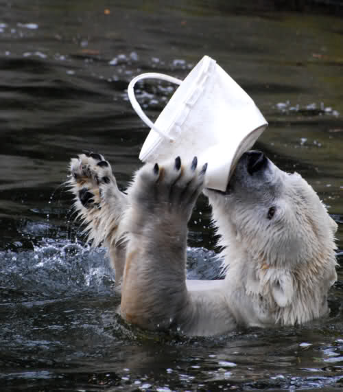 Ich habe hier mal eine Fotomontage erstellt, die zeigt, wie es aussehen könnte, wenn eine nichtspielende Eisbärin im Zoo Berlin einen Plastikeimer finden würde.