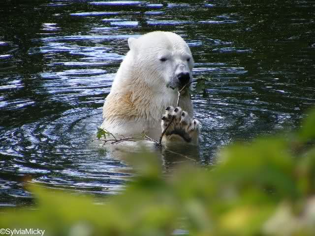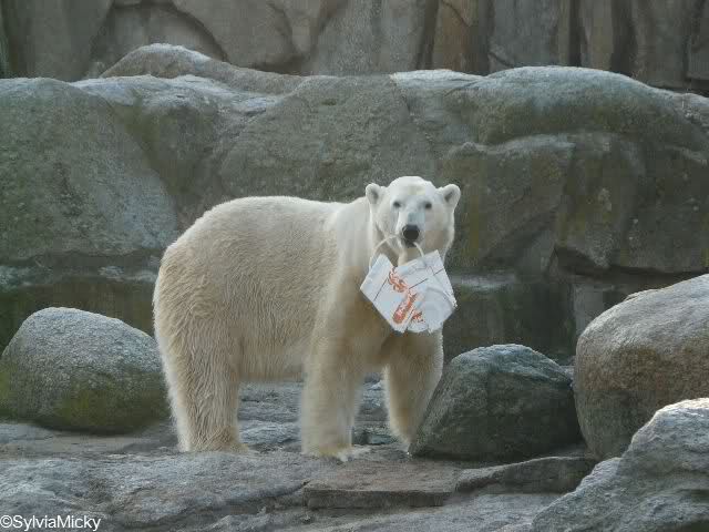 diese Fotomontage sieht aber echt aus. Habe schon einen Schrecken bekommen. Es gab nämlich auch mal einen Tierpfleger, der schwächelte und dem ab und zu ein Eimer aus der Hand fiel. Manchmal, wenn er mit einem Zweig (also Naturmaterial) den Staub von den Blättern an der Anlage fortwedelte, ist ihm auch der hineingefallen. Dann hättest Du mal die großen Eisbären, die nicht spielen wollen, sehen sollen. Sicher wollten sie dann ihren Graben reinigen - mit Eimer und Zweigen.